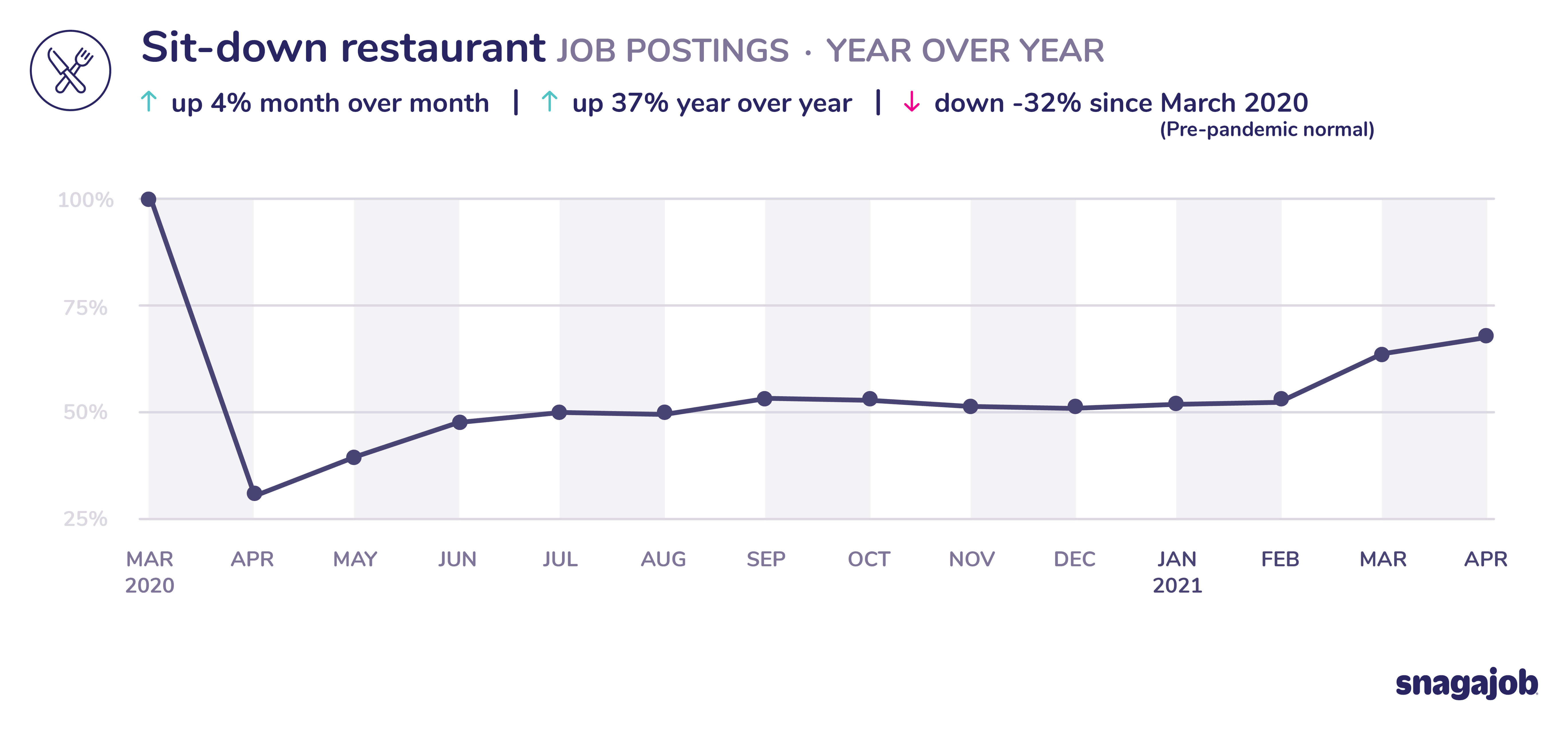 Sit-down restaurant jobs are down 32% compared to pre-pandemic norms, seeing 4% month over month growth and 37% year over year growth.
