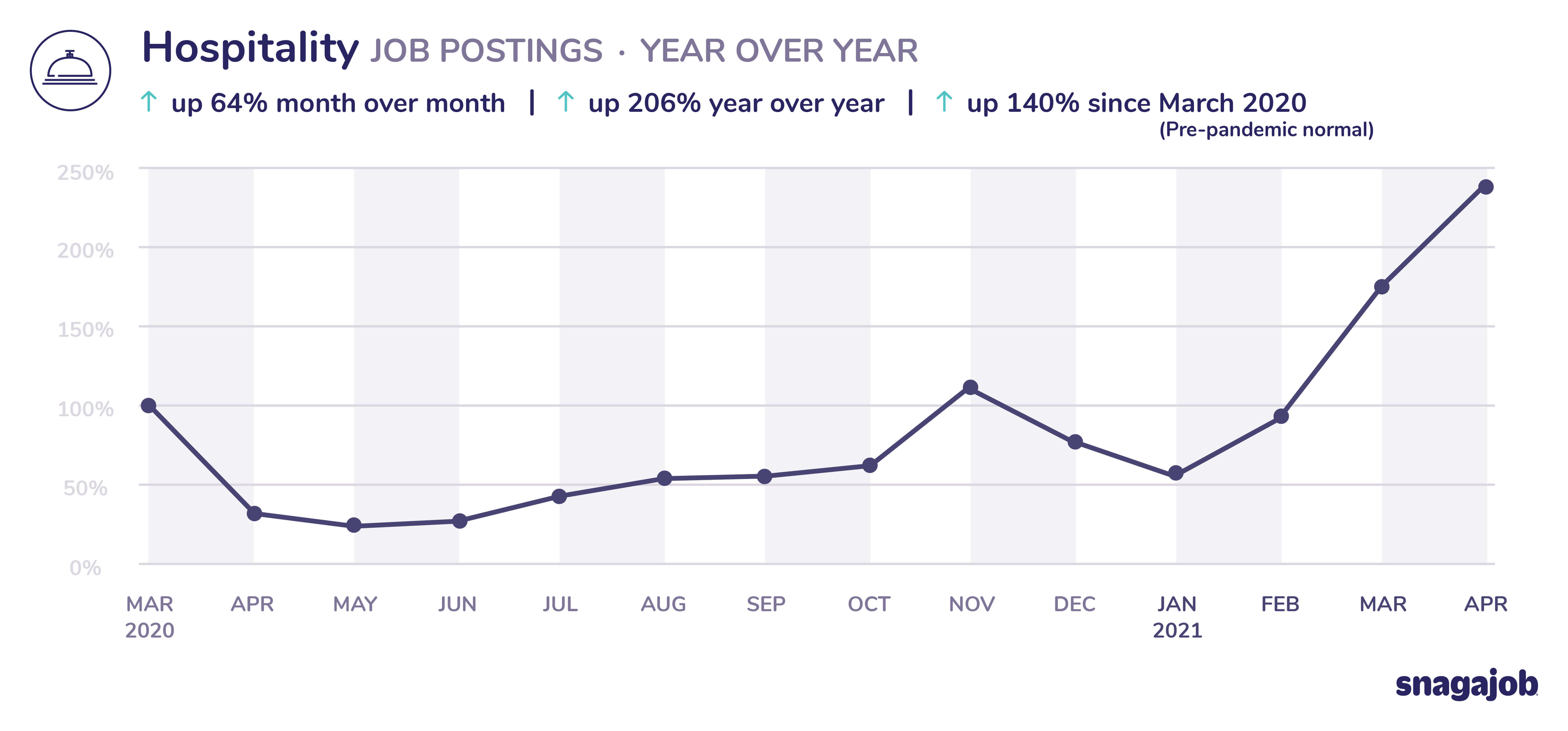 Hospitality jobs are up 140% compared to pre-pandemic norms, seeing 64% month over month growth and 206% year over year growth.