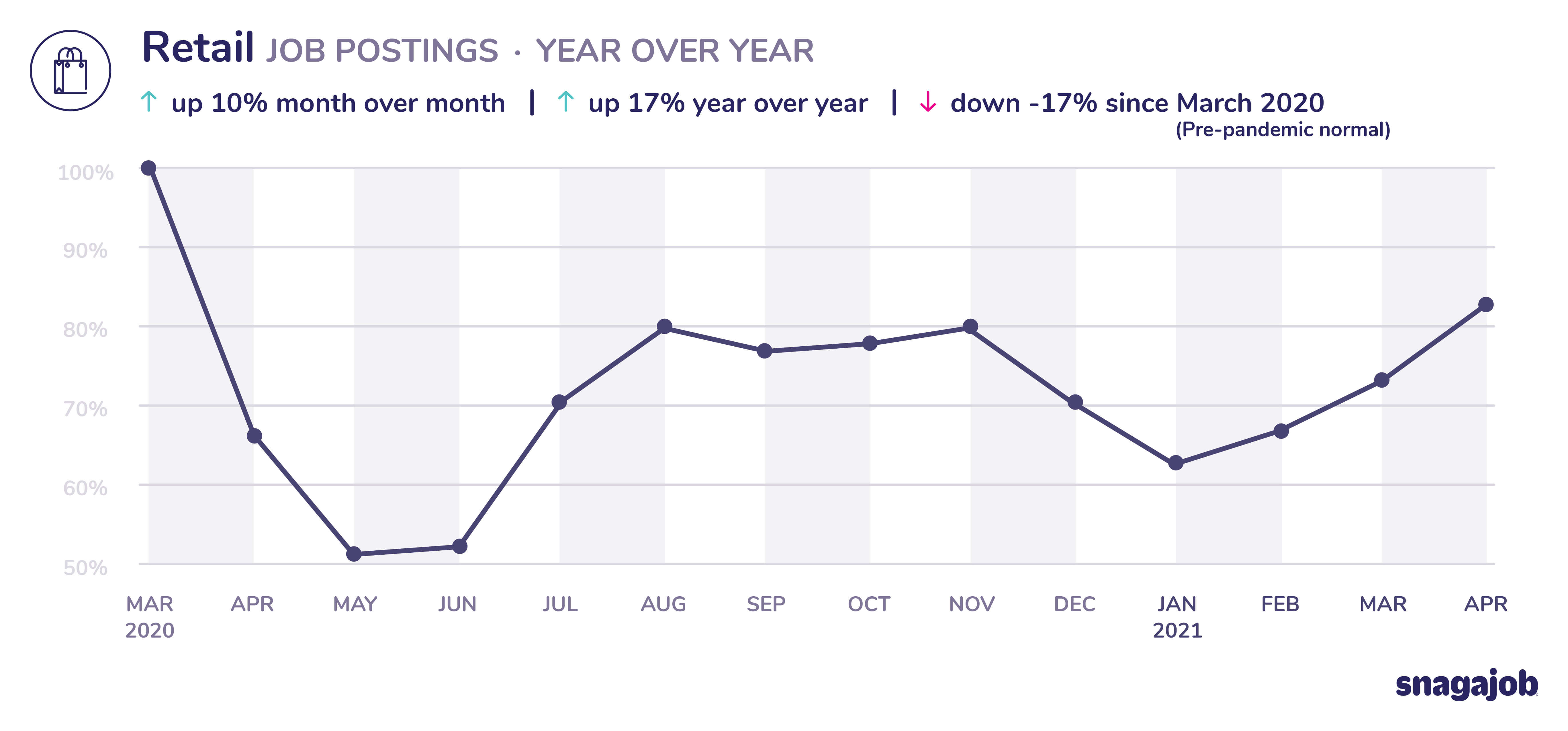 Retail jobs are down 17% compared to pre-pandemic norms, seeing 10% month over month growth and 17% year over year growth.