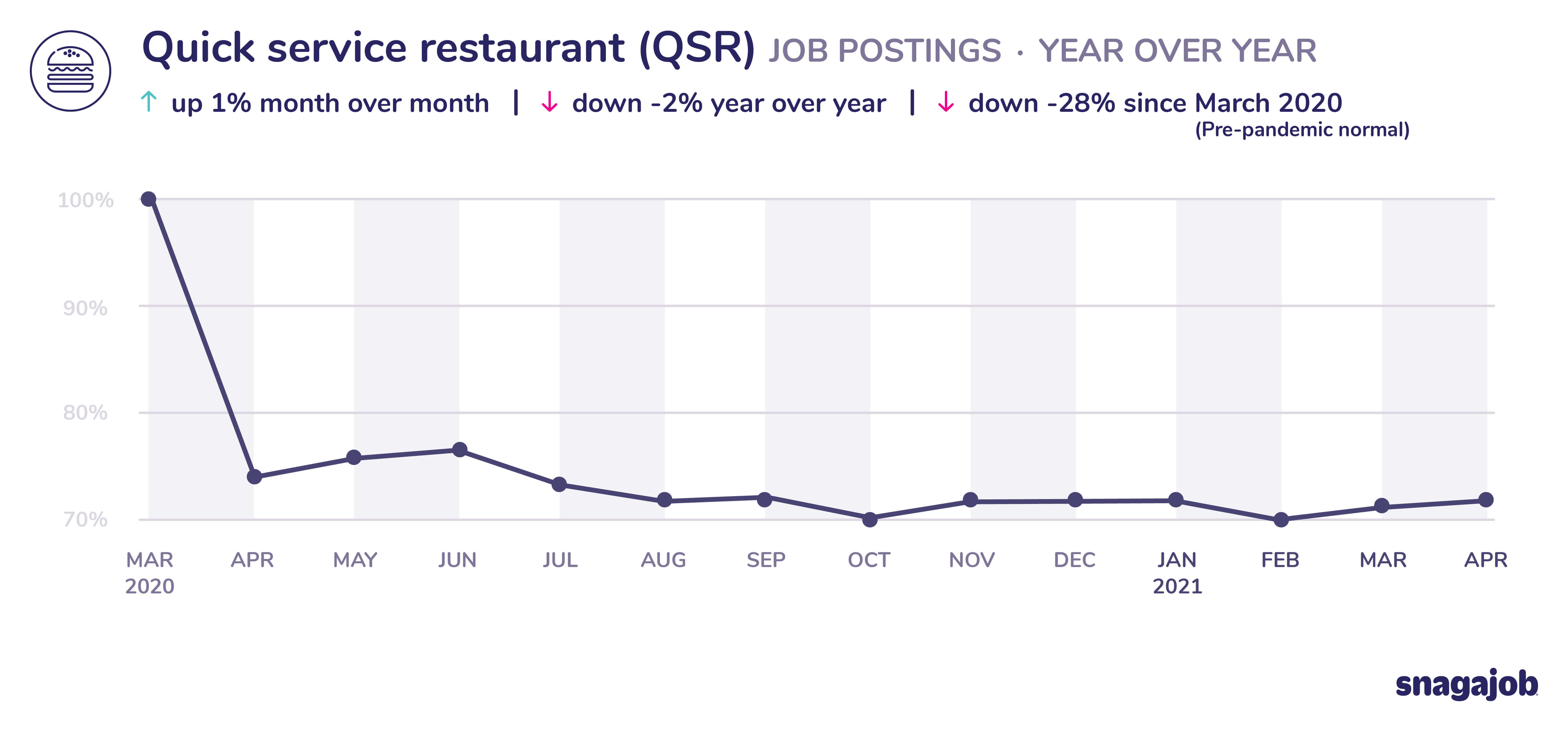 Quick service restaurant (QSR) jobs are down 28% compared to pre-pandemic norms, seeing 1% month over month growth and a 2% year over year decline.