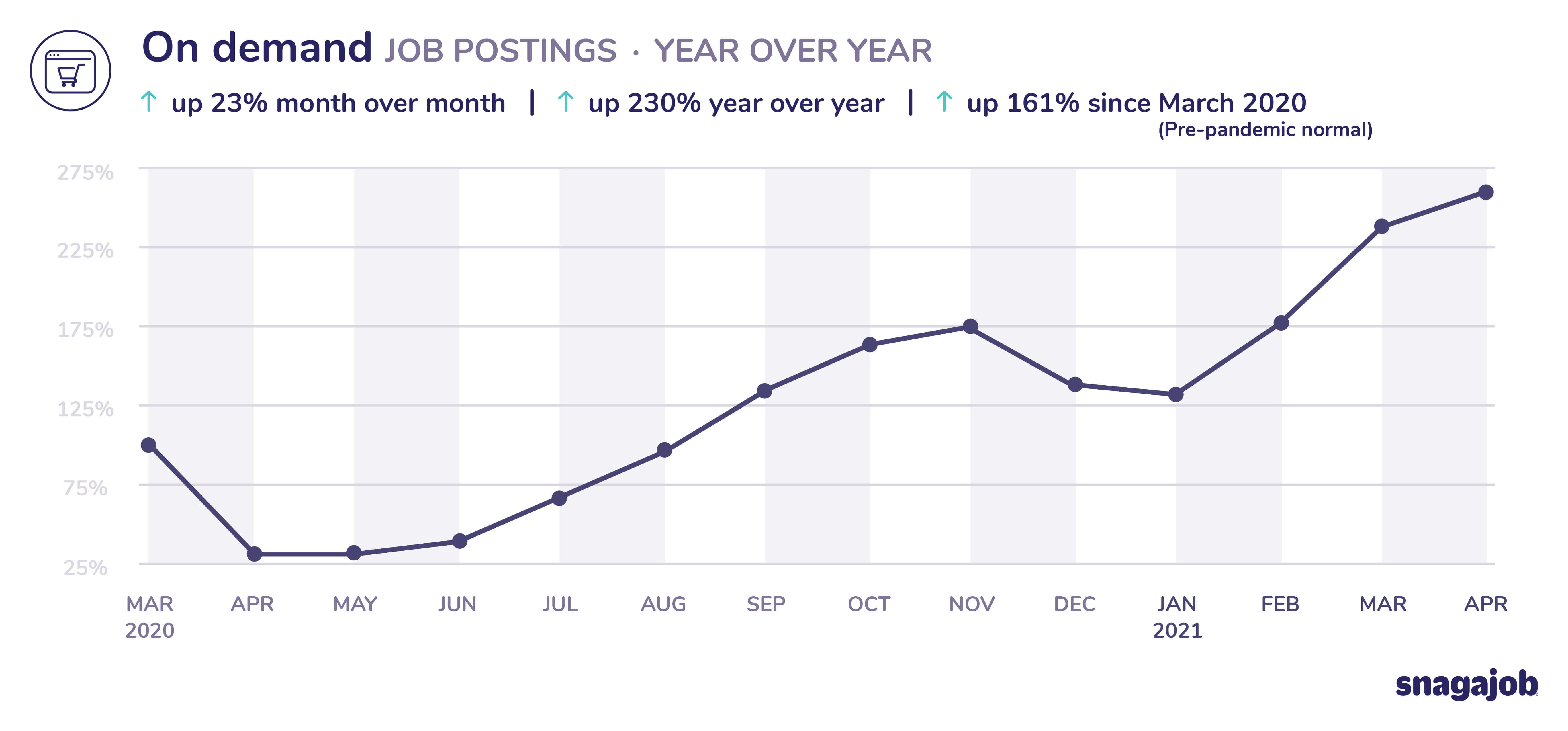 On demand jobs are up 161% compared to pre-pandemic norms, seeing 23% month over month growth and 230% year over year growth.