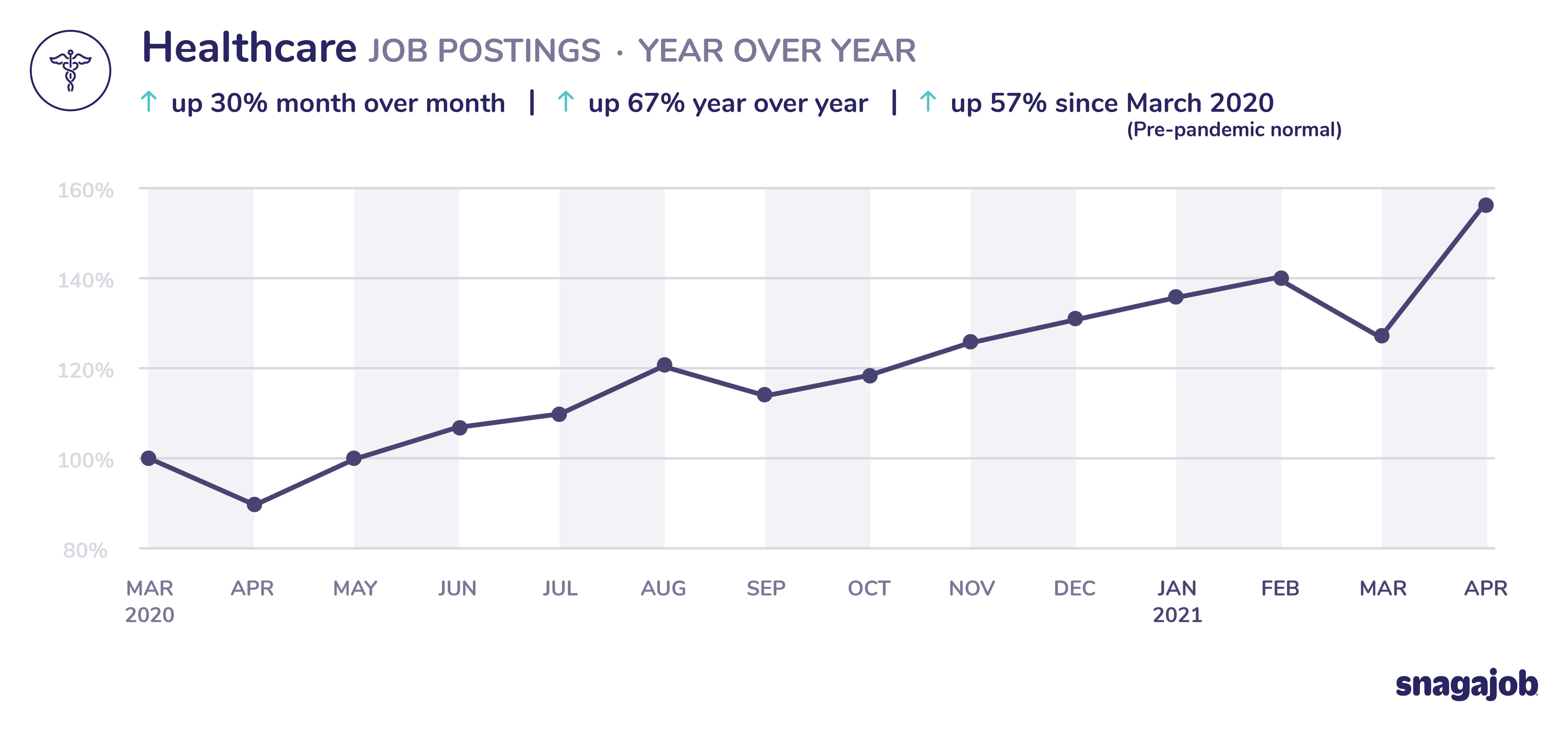Healthcare jobs are up 57% compared to pre-pandemic norms, seeing 30% month over month growth and 67% year over year growth.