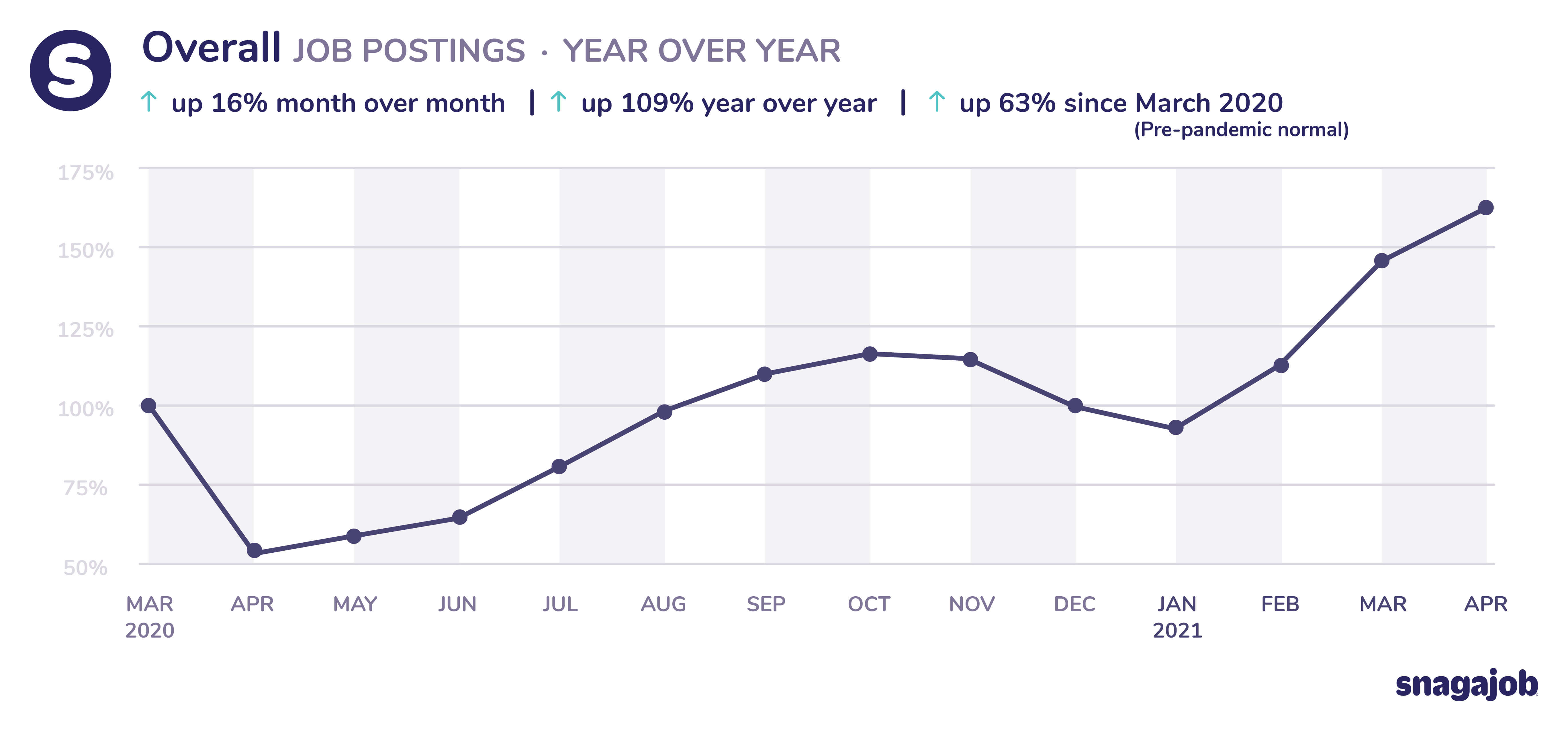 Overall jobs are up 63% compared to pre-pandemic norms, seeing 16% month over month growth and 109% year over year growth.