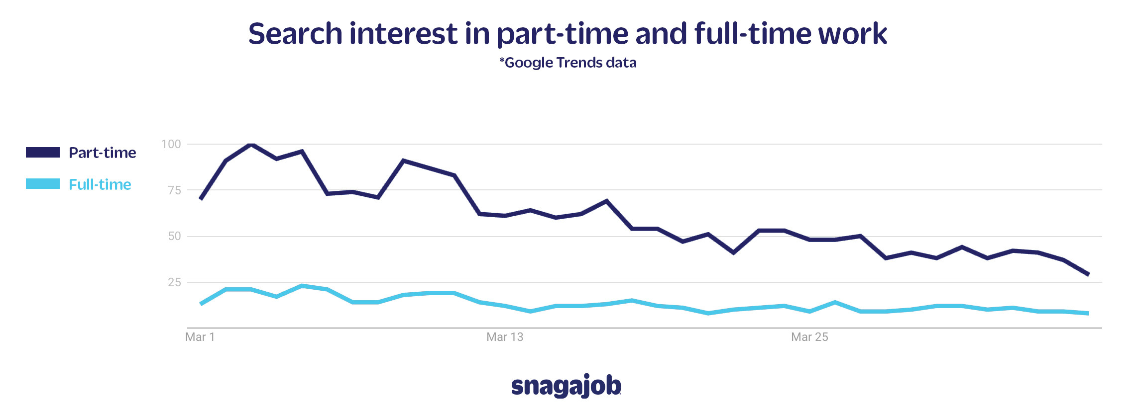 While searches are down, applications for jobs in cleaning (+383%), warehousing (+53%), grocery (+42%) and gig (+23%) are all up since March 1, which reflects broader hiring trends.