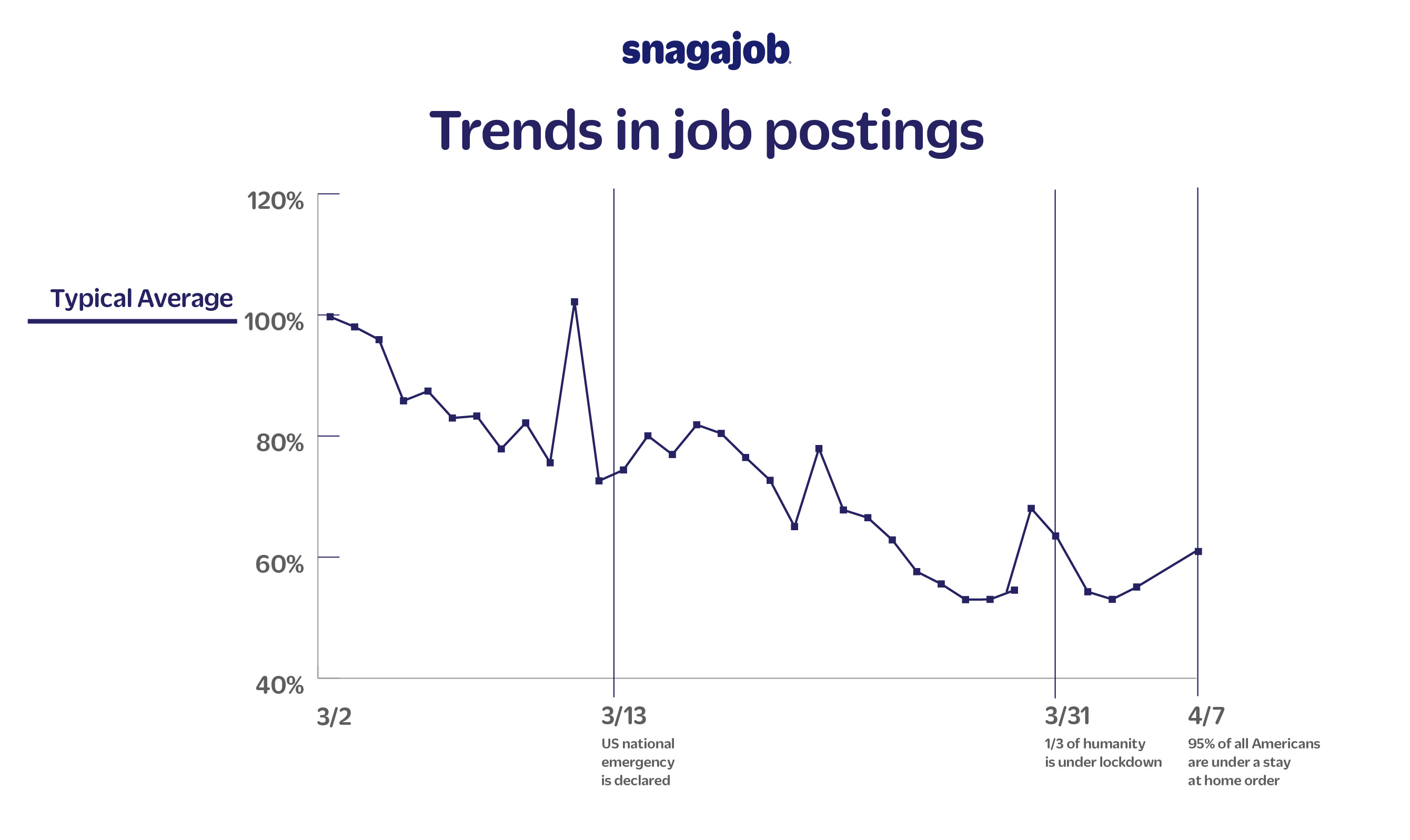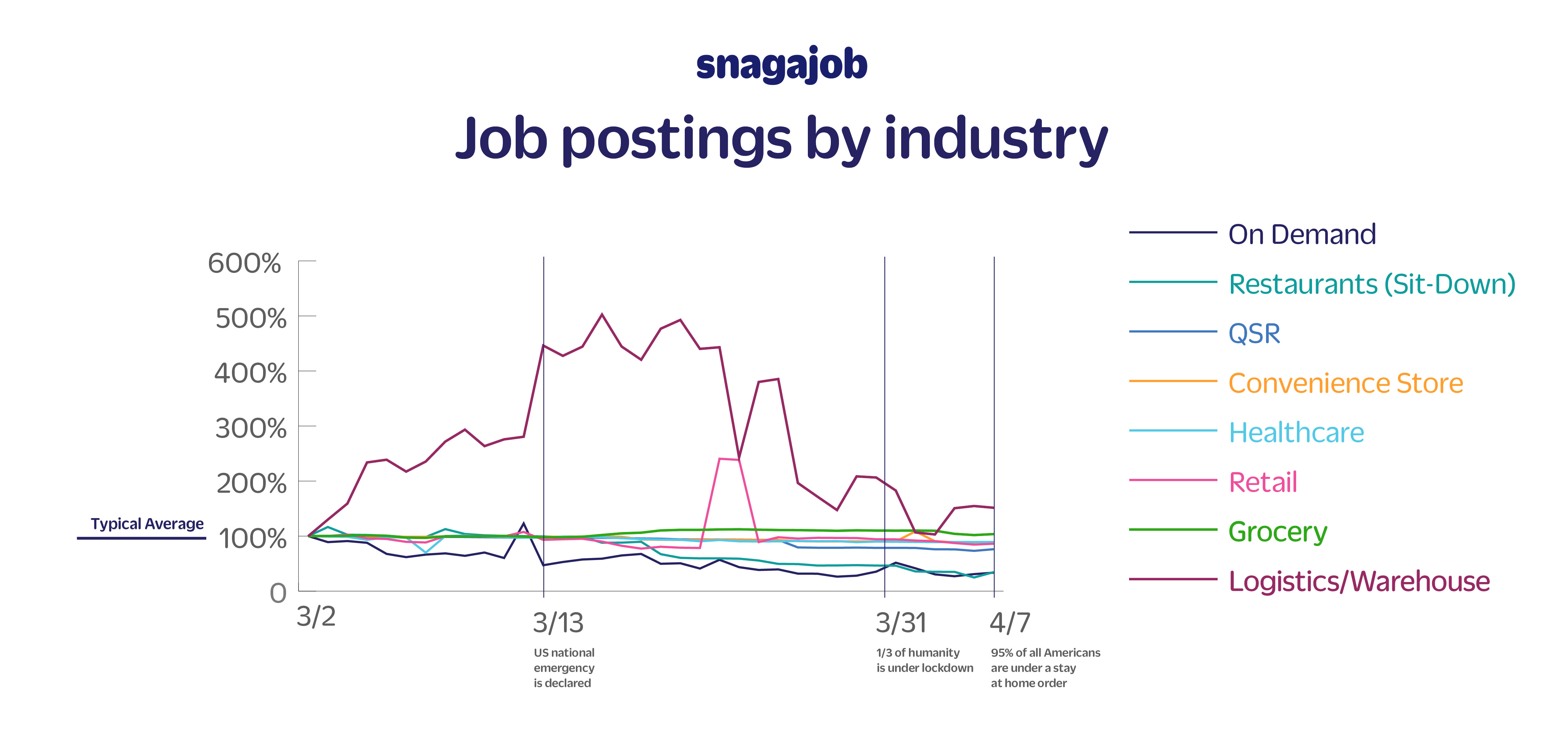 Navigating the hourly hiring landscape during this pandemic is new to all of us. At Snagajob, we have a unique perspective on hourly job trends because of our proprietary data—and it shows us how both workers and employers are responding in real-time. One of the most valuable things we can offer you right now is a view into these insights and critical hourly hiring trends. This way, you have the context you need as you make unprecedented business decisions to manage the economic impact of COVID-19.
