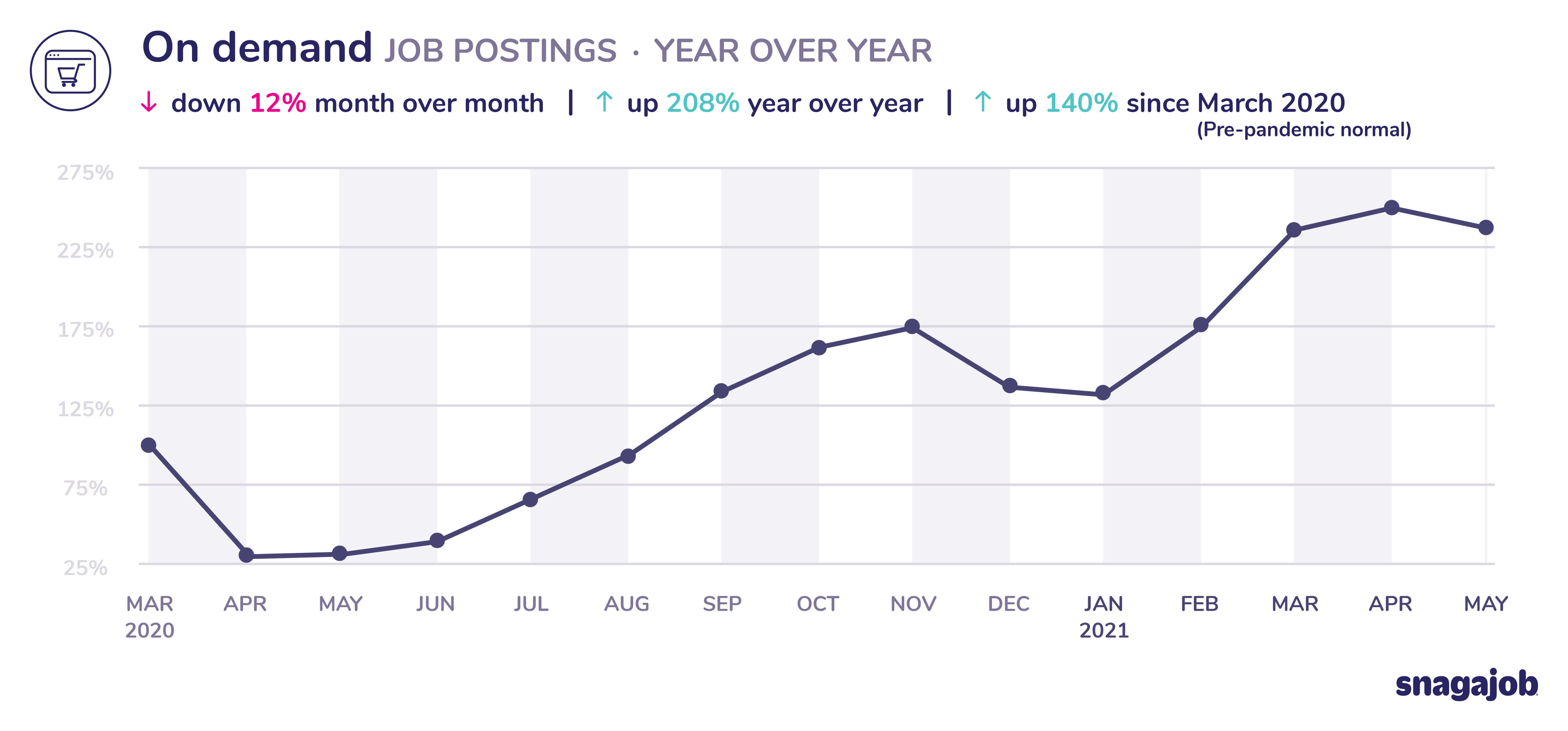 On demand jobs are up 140% compared to pre-pandemic norms, seeing a 12% month over month decline and 208% year over year growth.