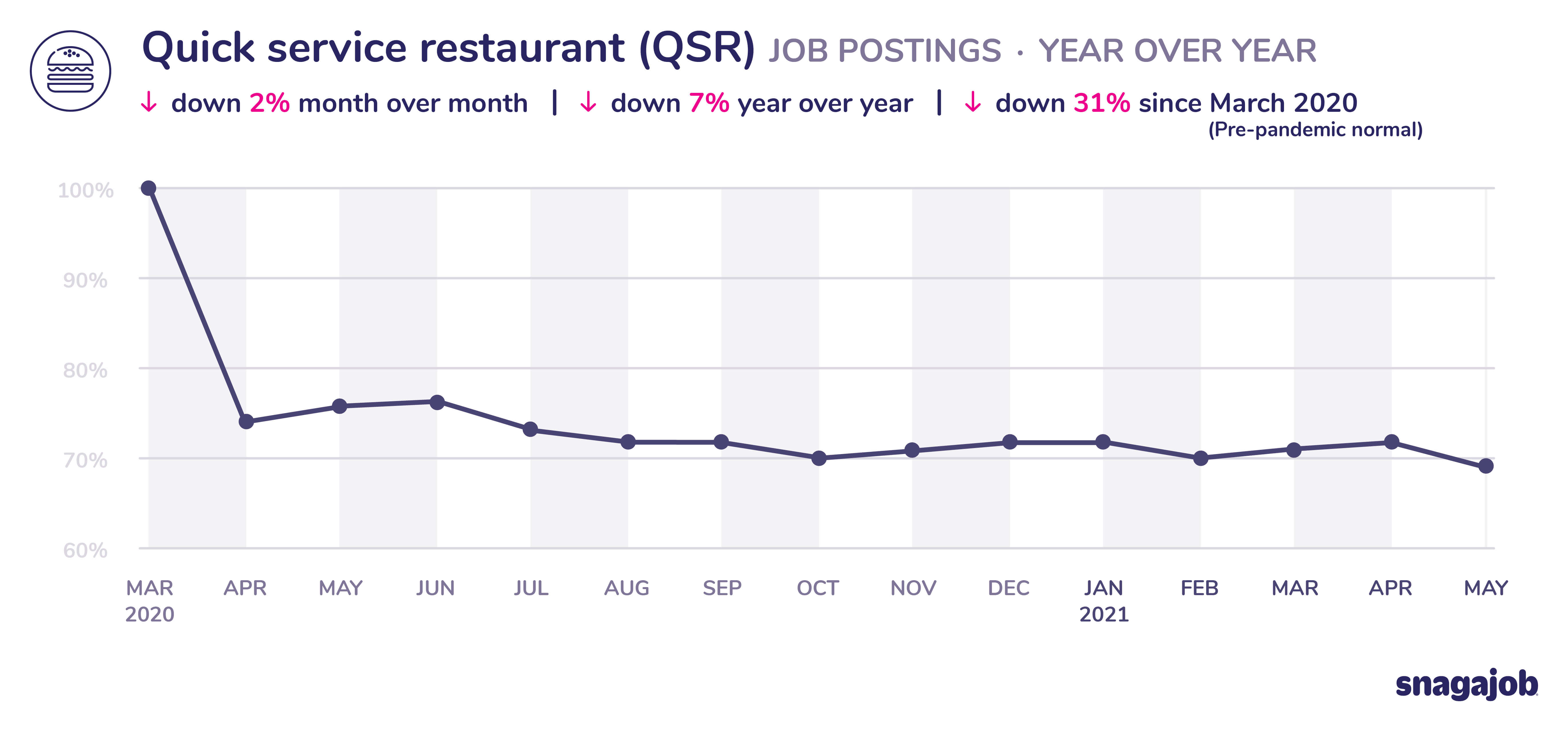 Quick service restaurant (QSR) jobs are down 31% compared to pre-pandemic norms, seeing a 2% month over month decline and a 7% year over year decline.