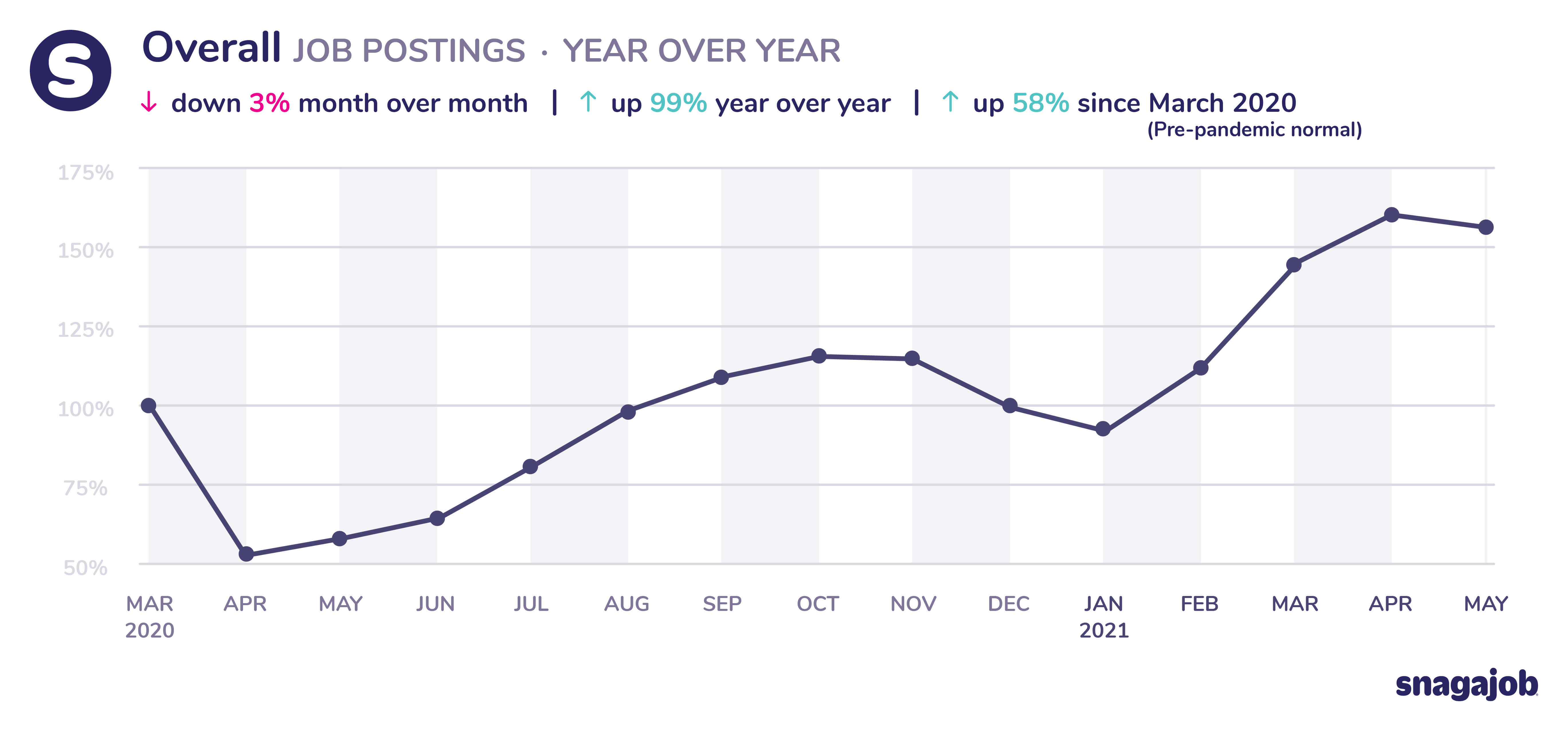 Overall jobs are up 58% compared to pre-pandemic norms, down 3% month over month and up 99% year over year.