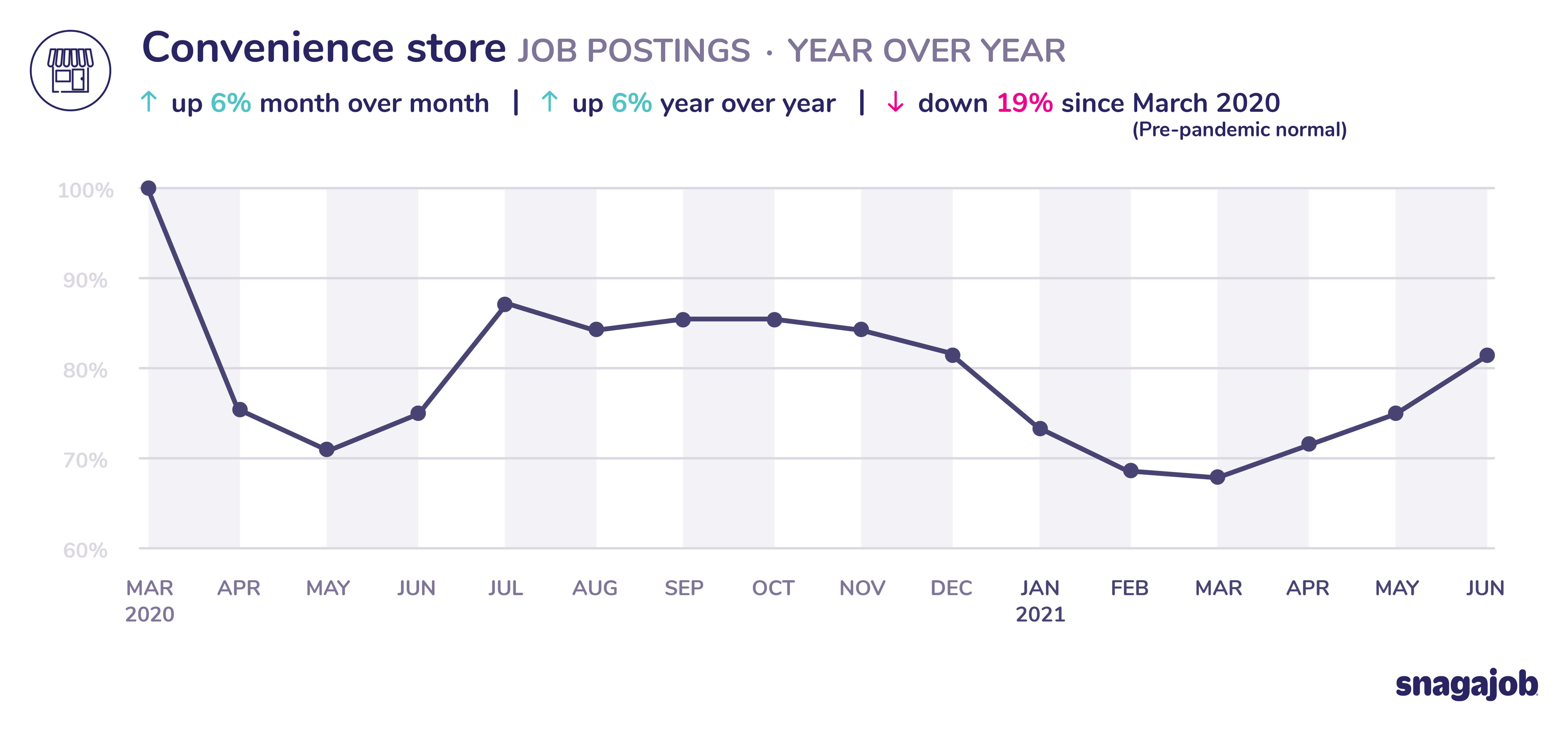 Convenience store jobs are down 19% compared to pre-pandemic norms, seeing 6% month over month growth and 6% year over year growth.