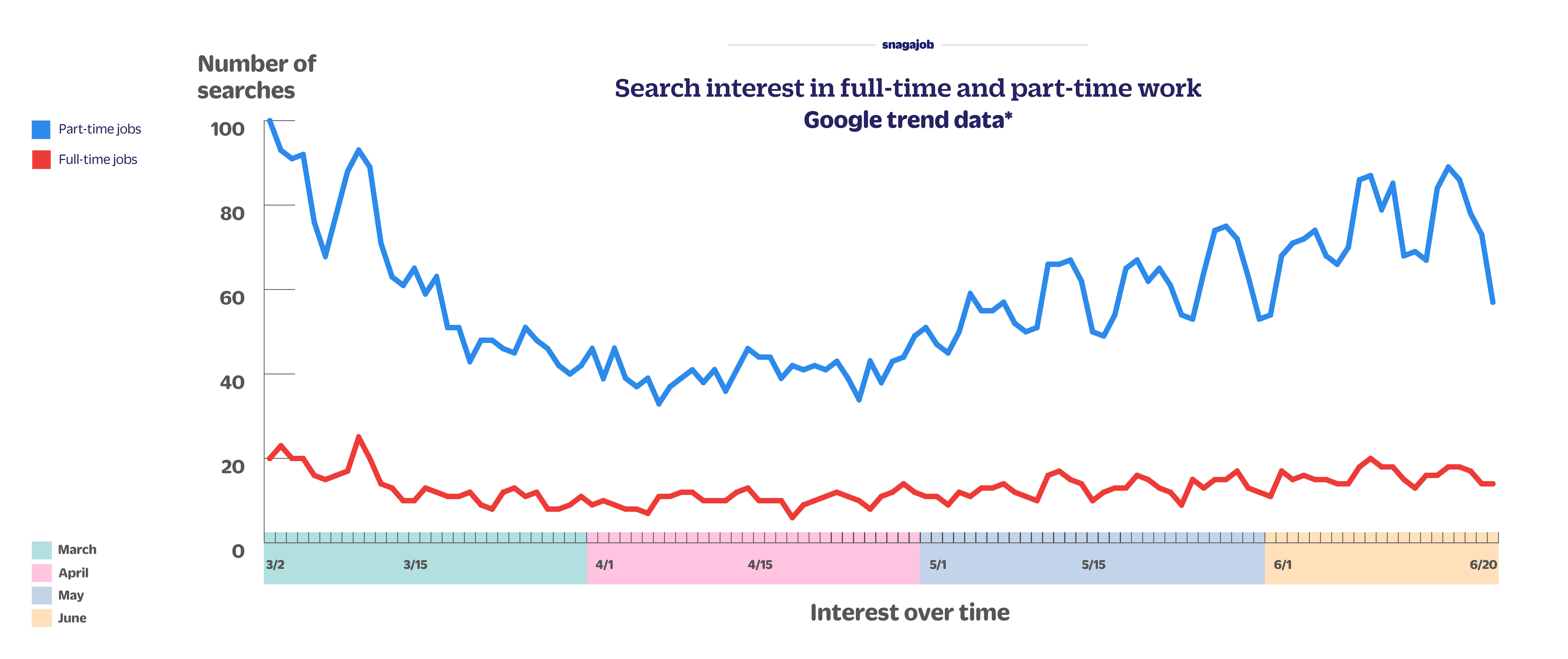 Google searches for part-time jobs are down 43% since early March and down 10% week over week.