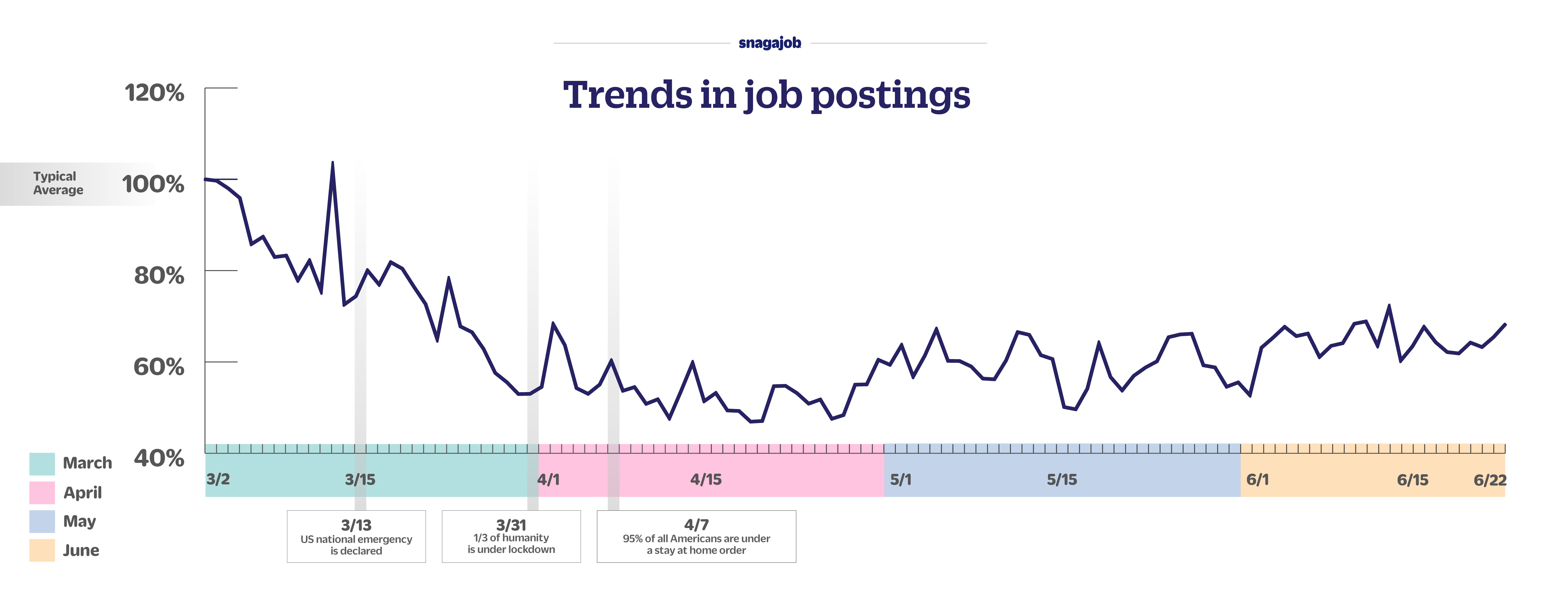 Snagajob is here to help you navigate the hourly hiring landscape during this pandemic. Our proprietary data gives us a unique perspective on hourly job trends and we can see how both workers and employers are responding in real-time. One of the most valuable things we can offer you is a view into these insights and hiring trends. We’re here to give you helpful context as you make business decisions.