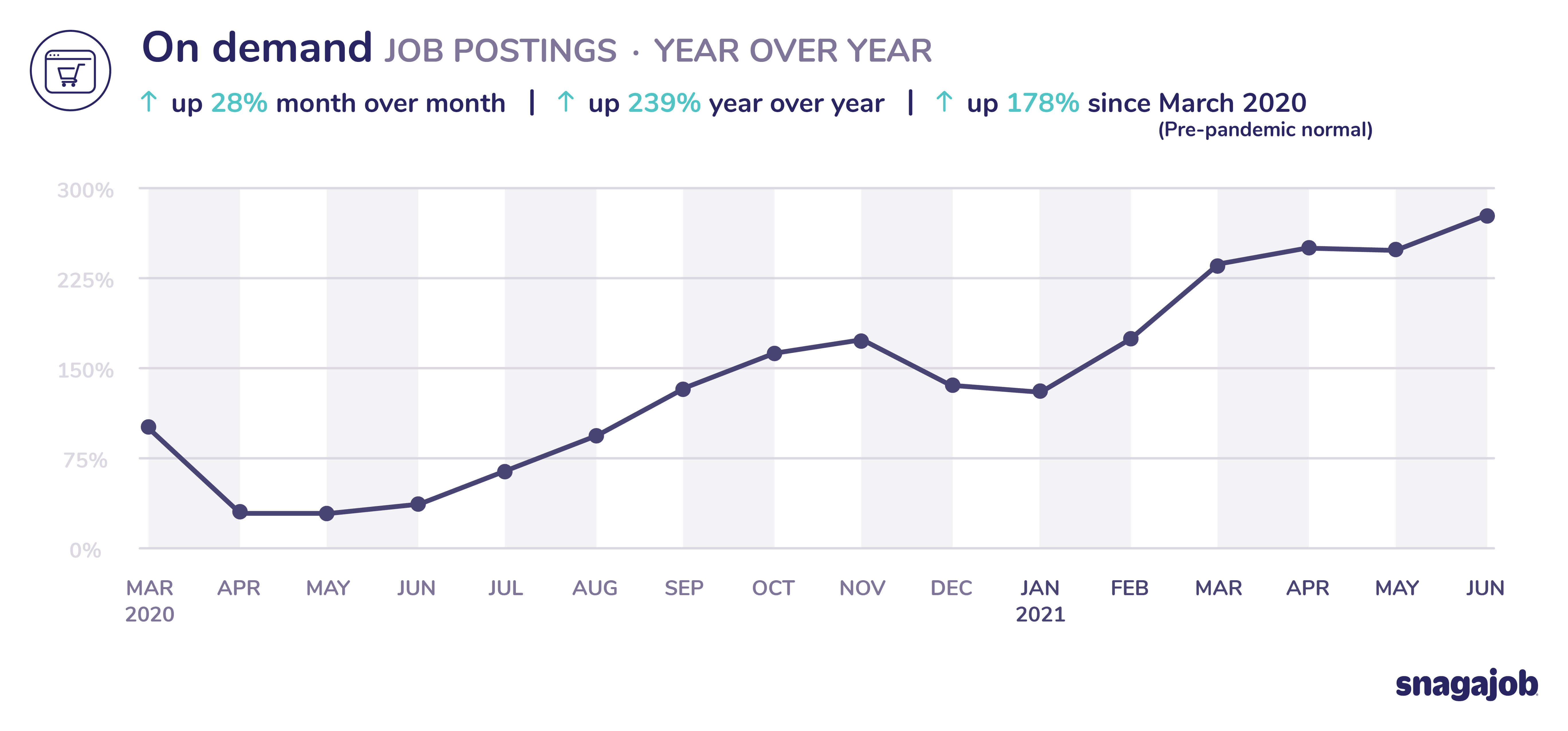 On demand jobs are up 178% compared to pre-pandemic norms, seeing 28% month over month growth and 239% year over year growth.