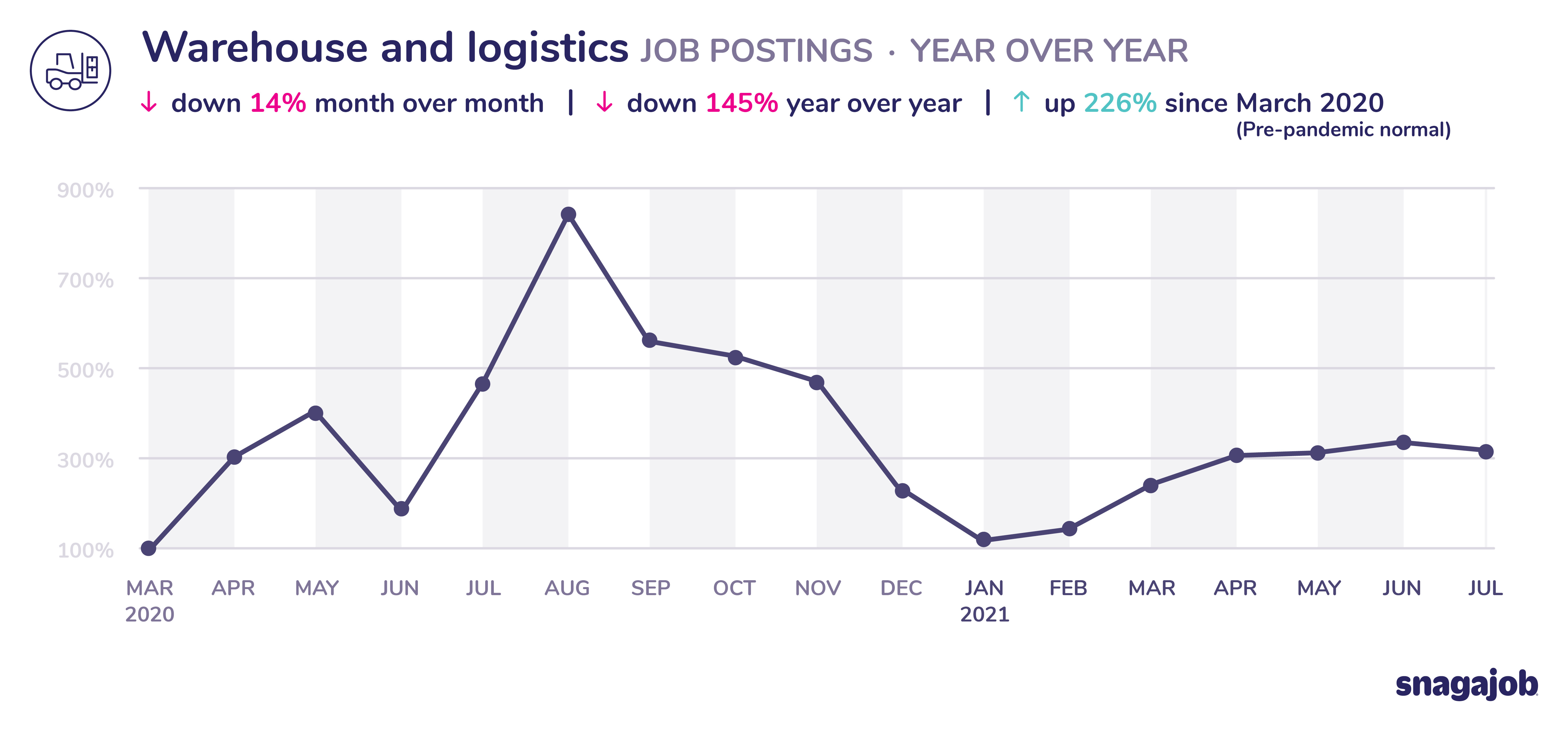 Warehouse and logistics jobs are up 226% compared to pre-pandemic norms, seeing a 14% month over month decline and a 145% year over year decline.