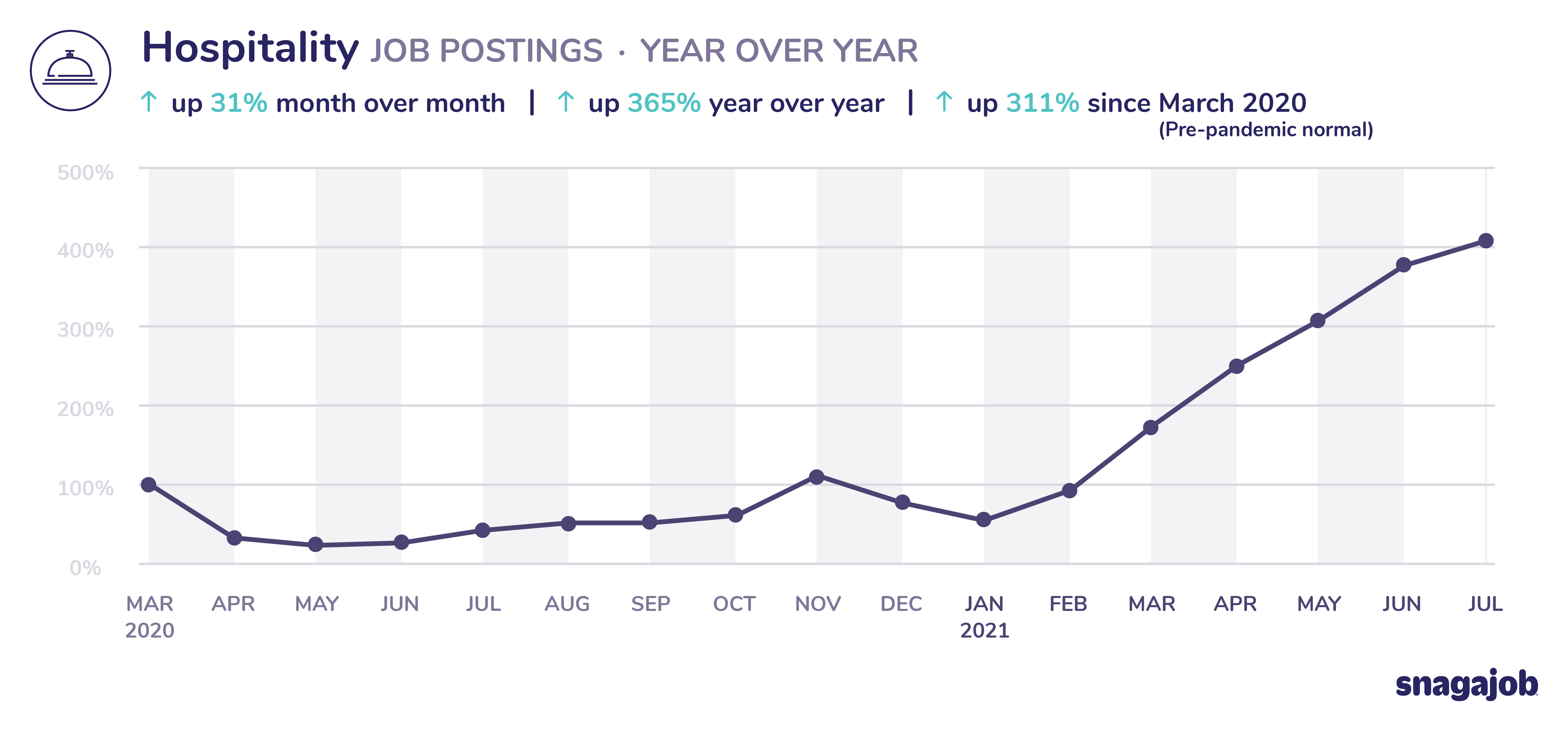 Hospitality jobs are up 311% compared to pre-pandemic norms, seeing 31% month over month growth and 365% year over year growth.