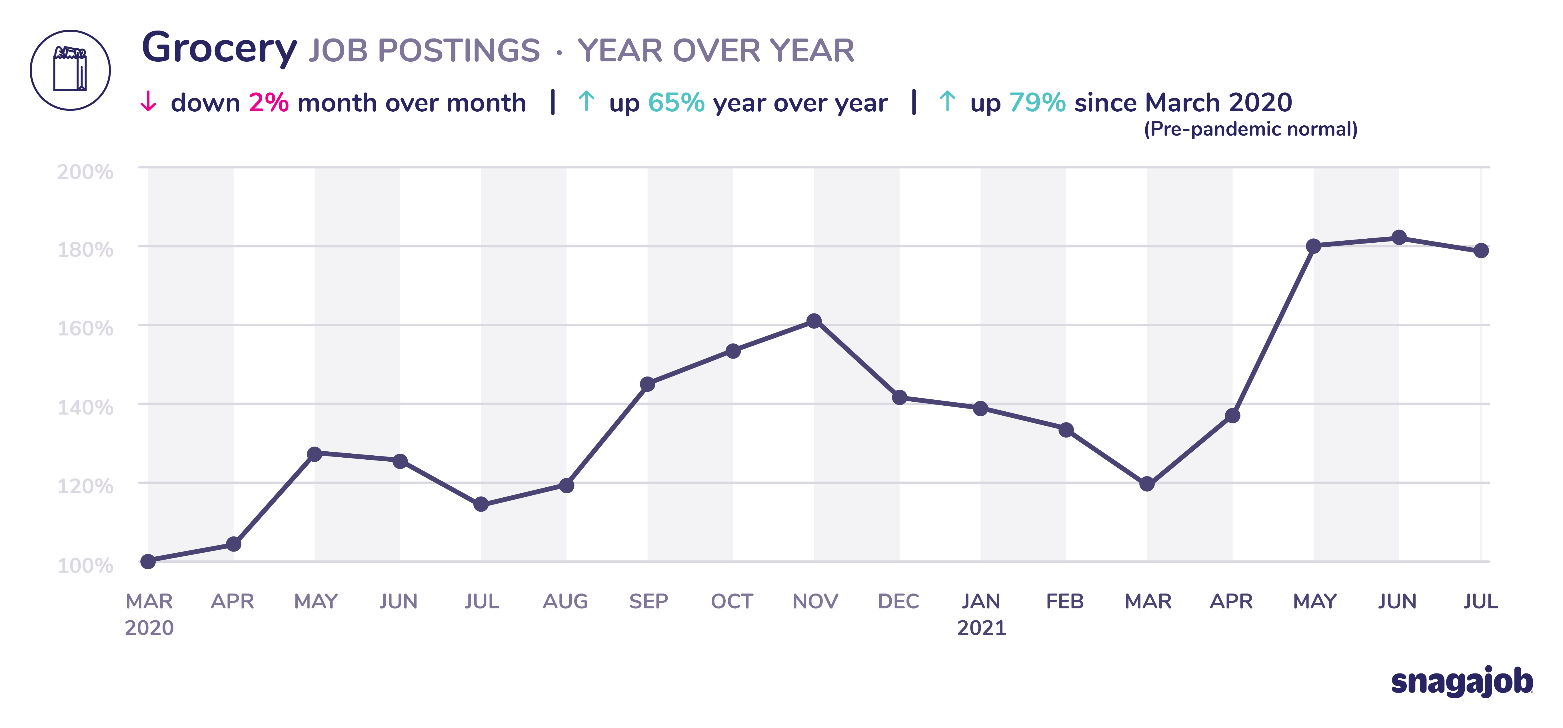 Grocery jobs are up 79% compared to pre-pandemic norms, seeing a 2% month over month decline and 65% year over year growth.