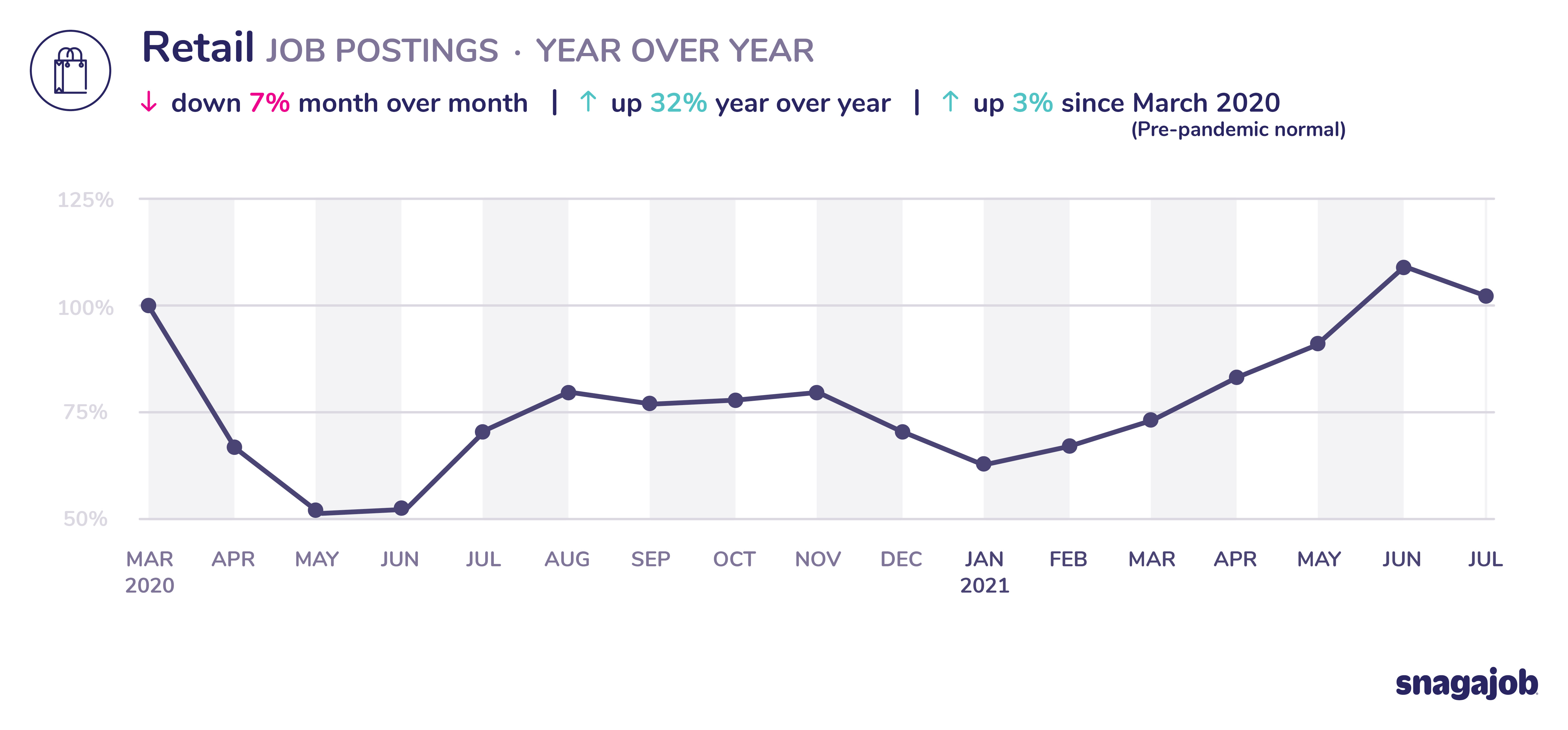 Retail jobs are up 3% compared to pre-pandemic norms, seeing a 7% month over month decline and 32% year over year growth.