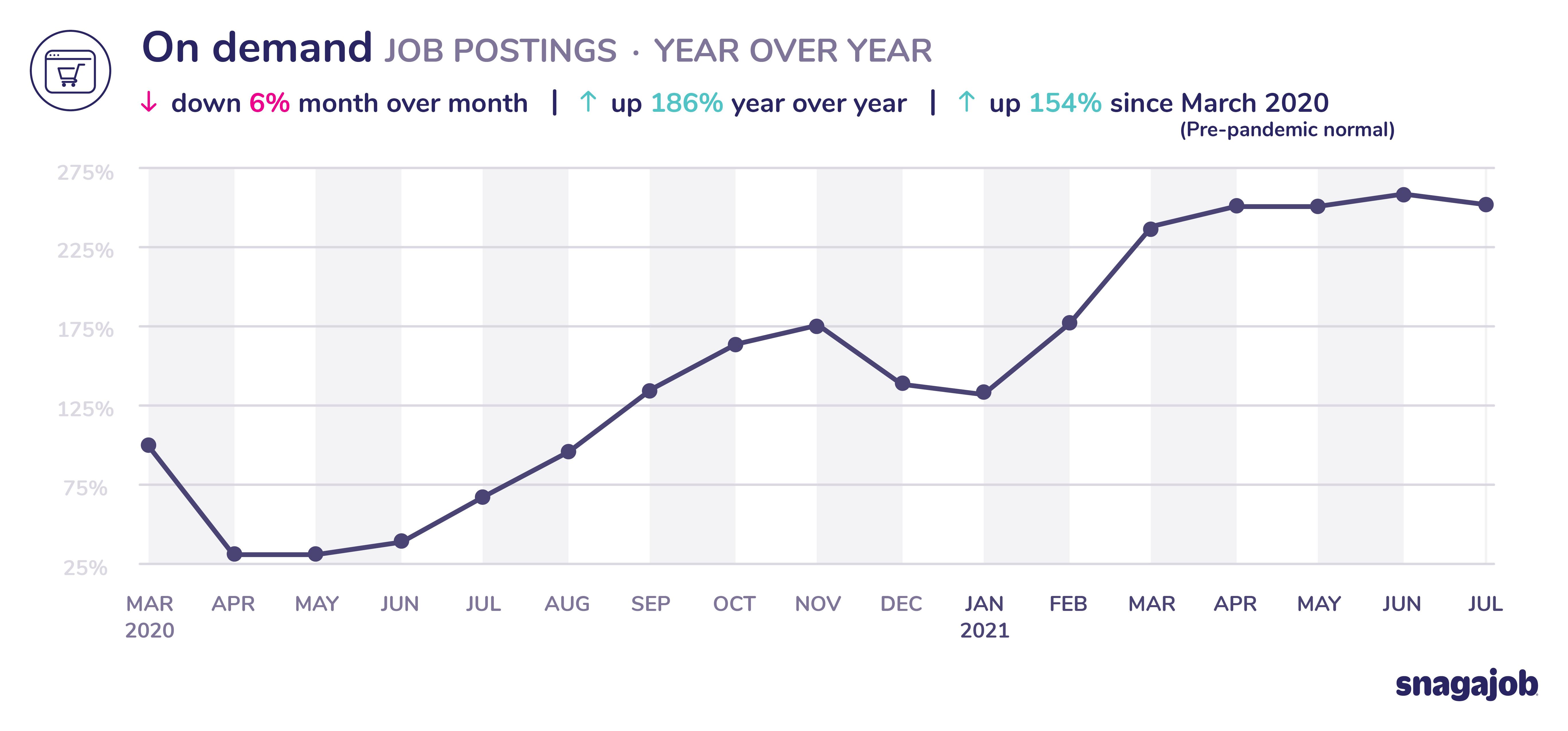 On demand jobs are up 154% compared to pre-pandemic norms, seeing a 6% month over month decline and 186% year over year growth.