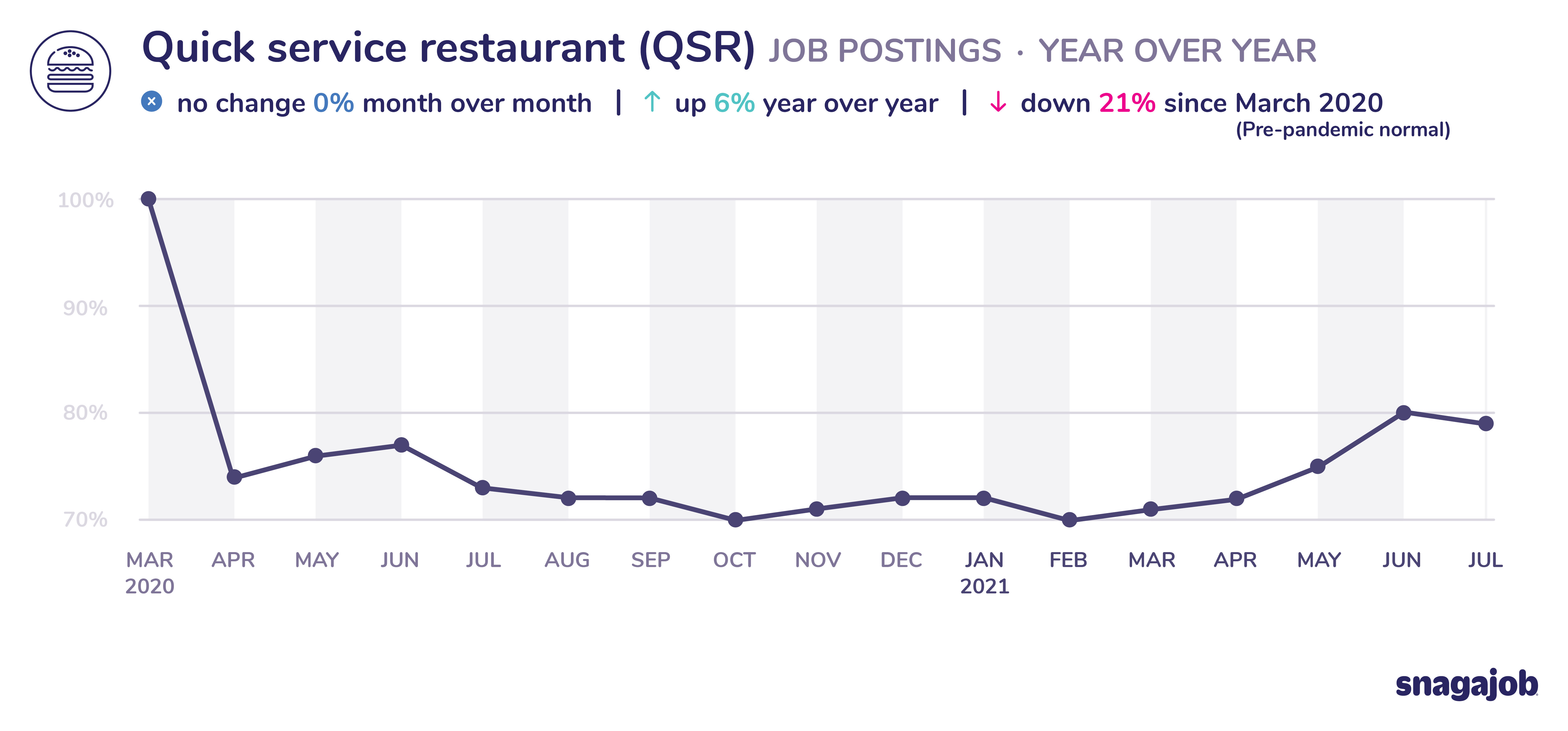 Quick service restaurant (QSR) jobs are down 21% compared to pre-pandemic norms, flat month over month growth and 6% year over year growth.