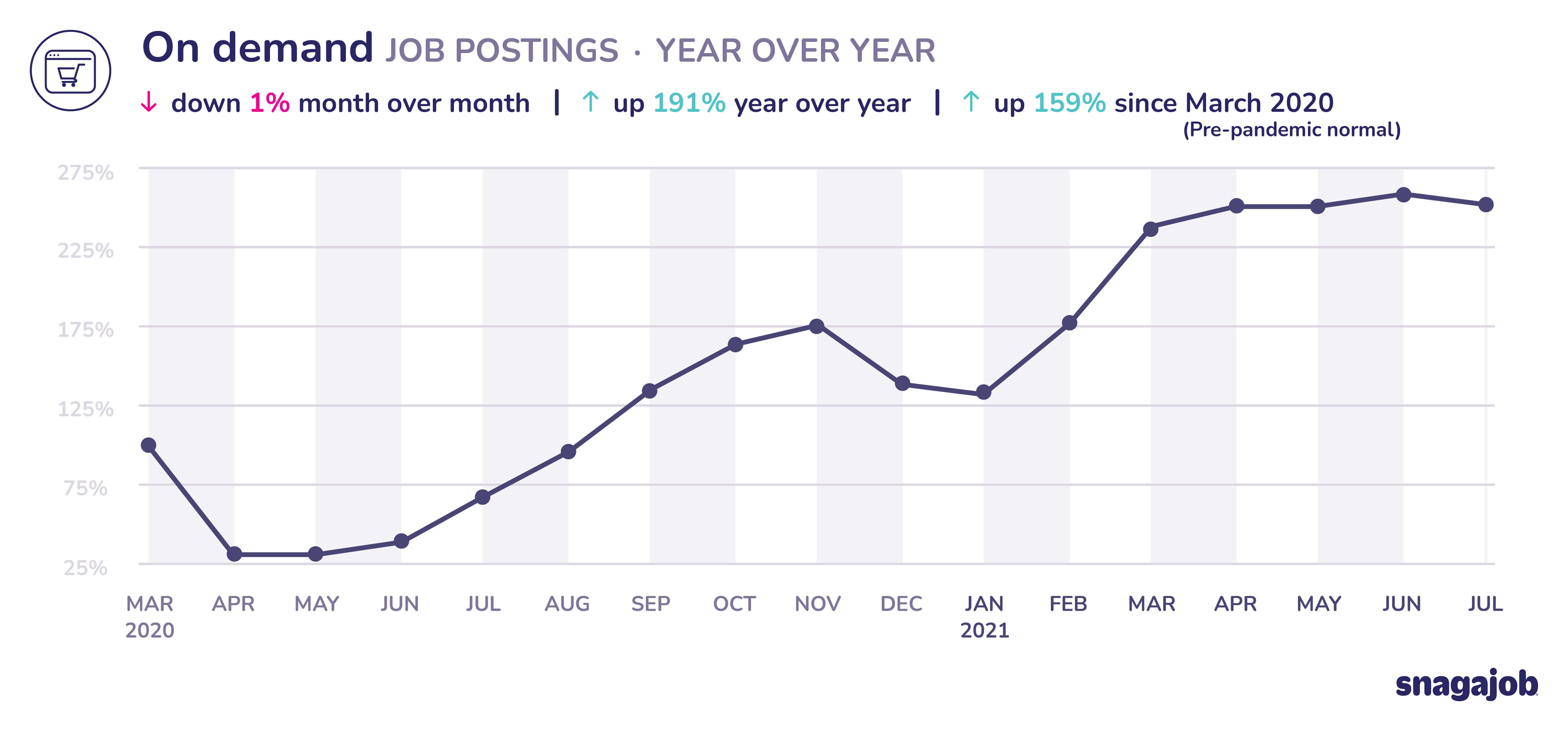 On demand jobs are up 159% compared to pre-pandemic norms, seeing a 1% month over month decline and 191% year over year growth.