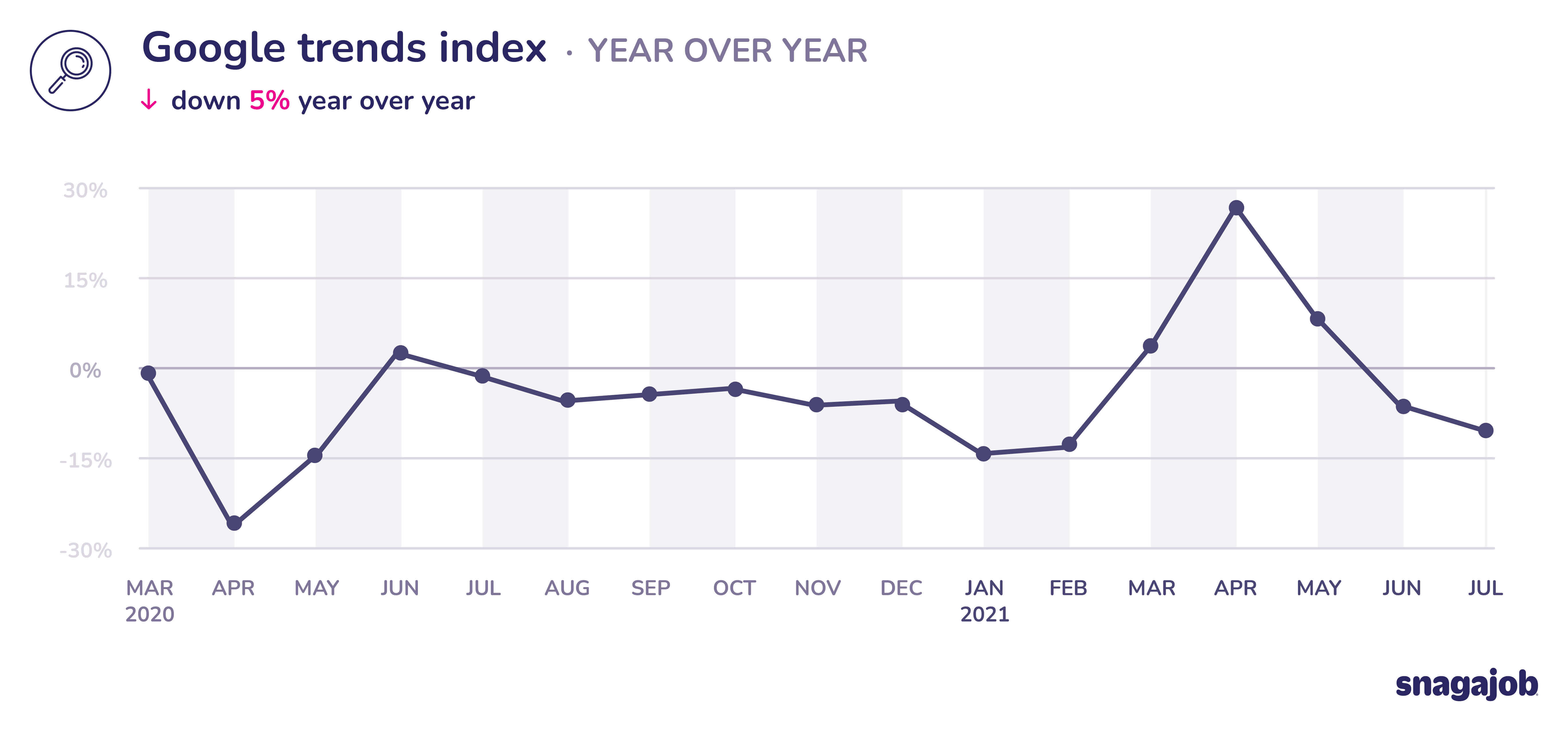 Overall jobs are up 65% compared to pre-pandemic norms, seeing a 1% month over month decline and 83% year over year growth. Google searches for hourly jobs are down 5% year over year.