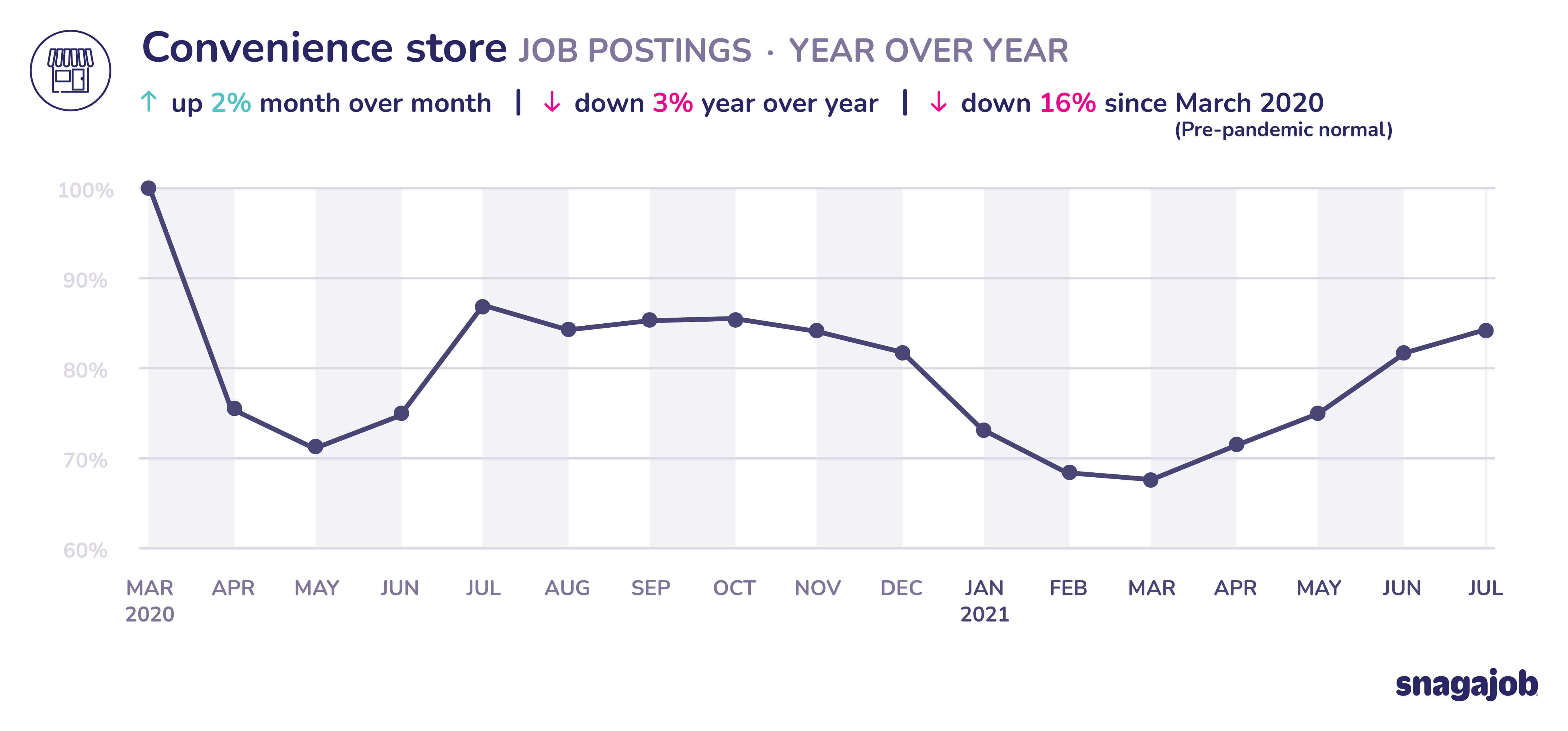 Convenience store jobs are down 16% compared to pre-pandemic norms, seeing 2% month over month growth and a 3% year over year decline.