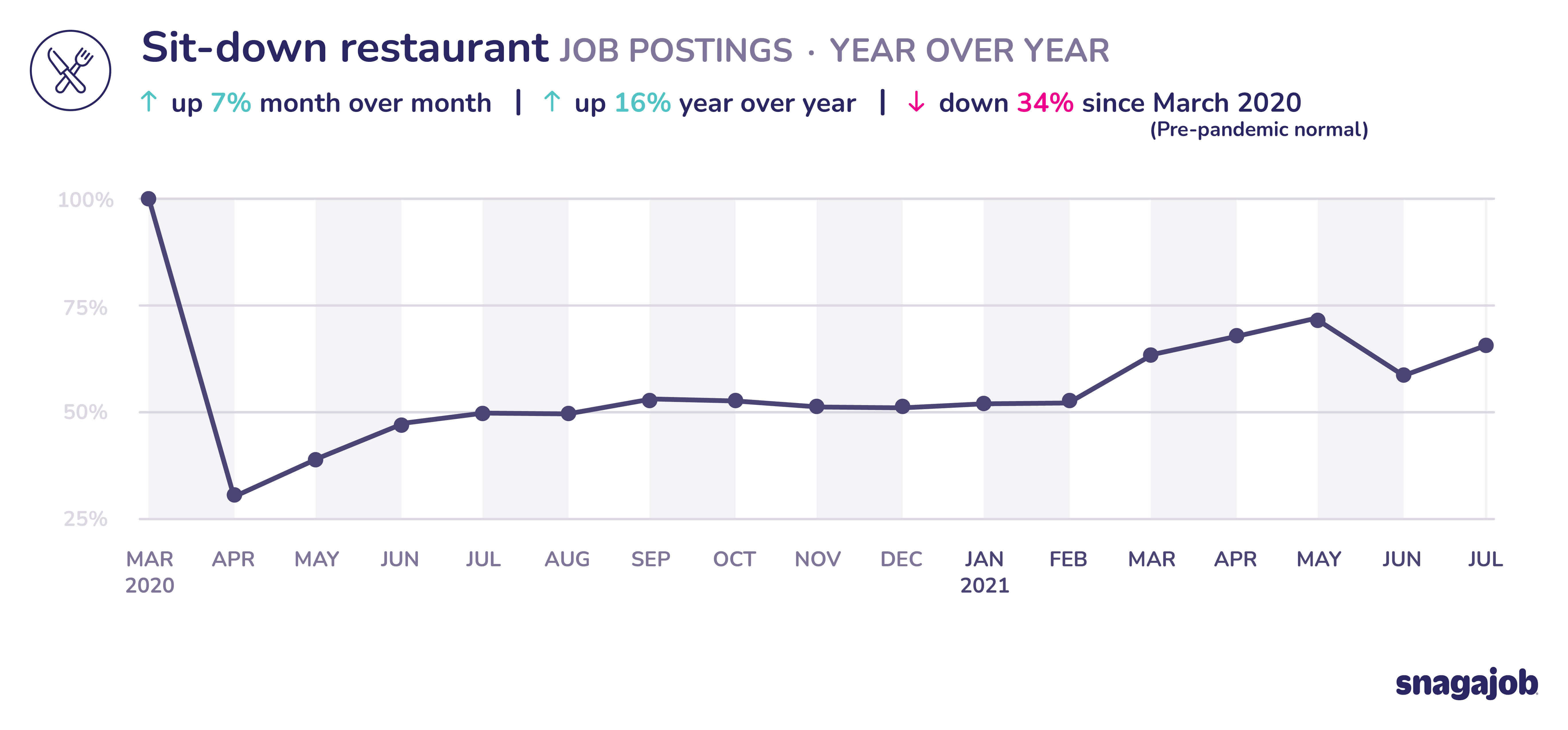 Sit-down restaurant jobs are down 34% compared to pre-pandemic norms, seeing 7% month over month growth and 16% year over year growth.