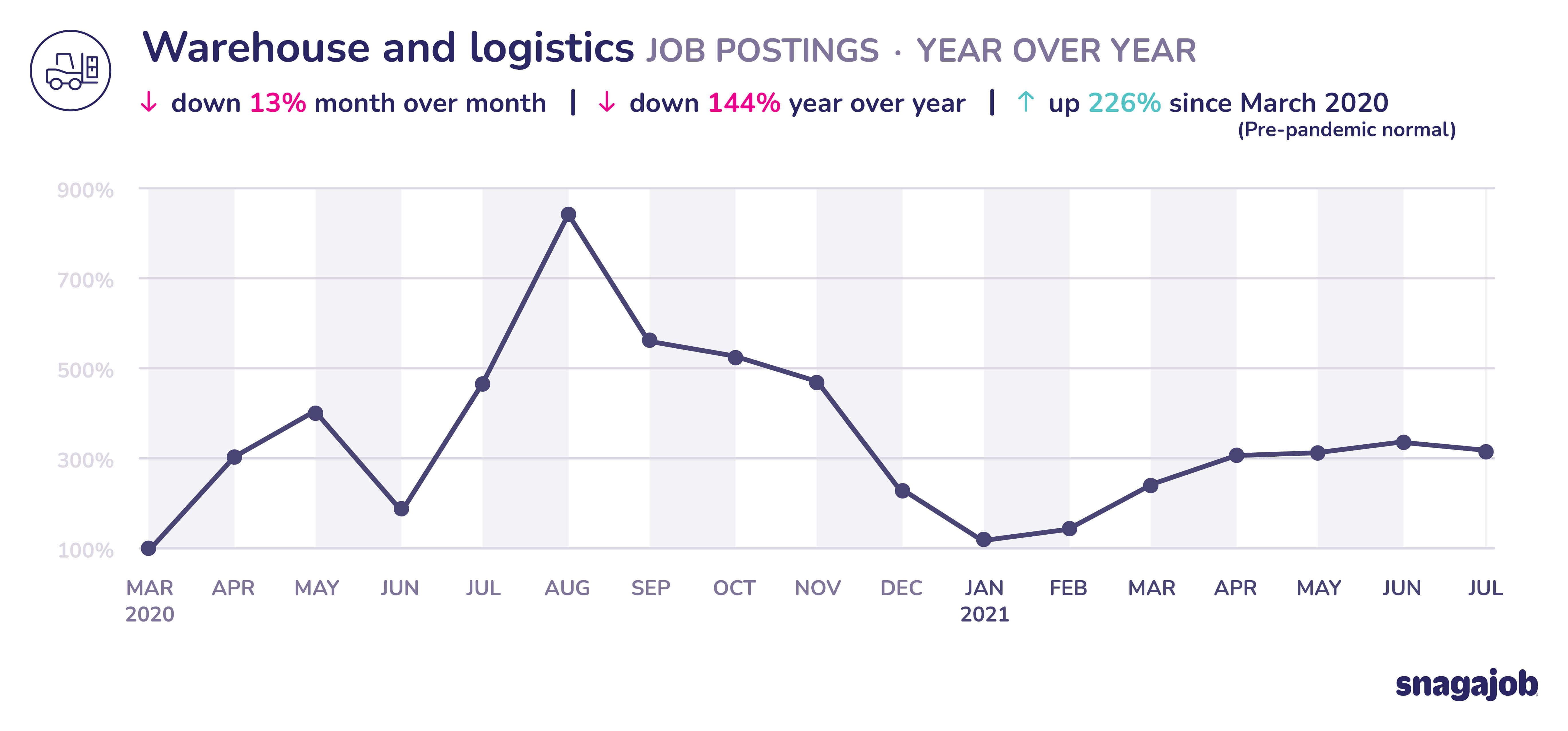 Warehouse and logistics jobs are up 226% compared to pre-pandemic norms, seeing a 13% month over month decline and a 144% year over year decline.