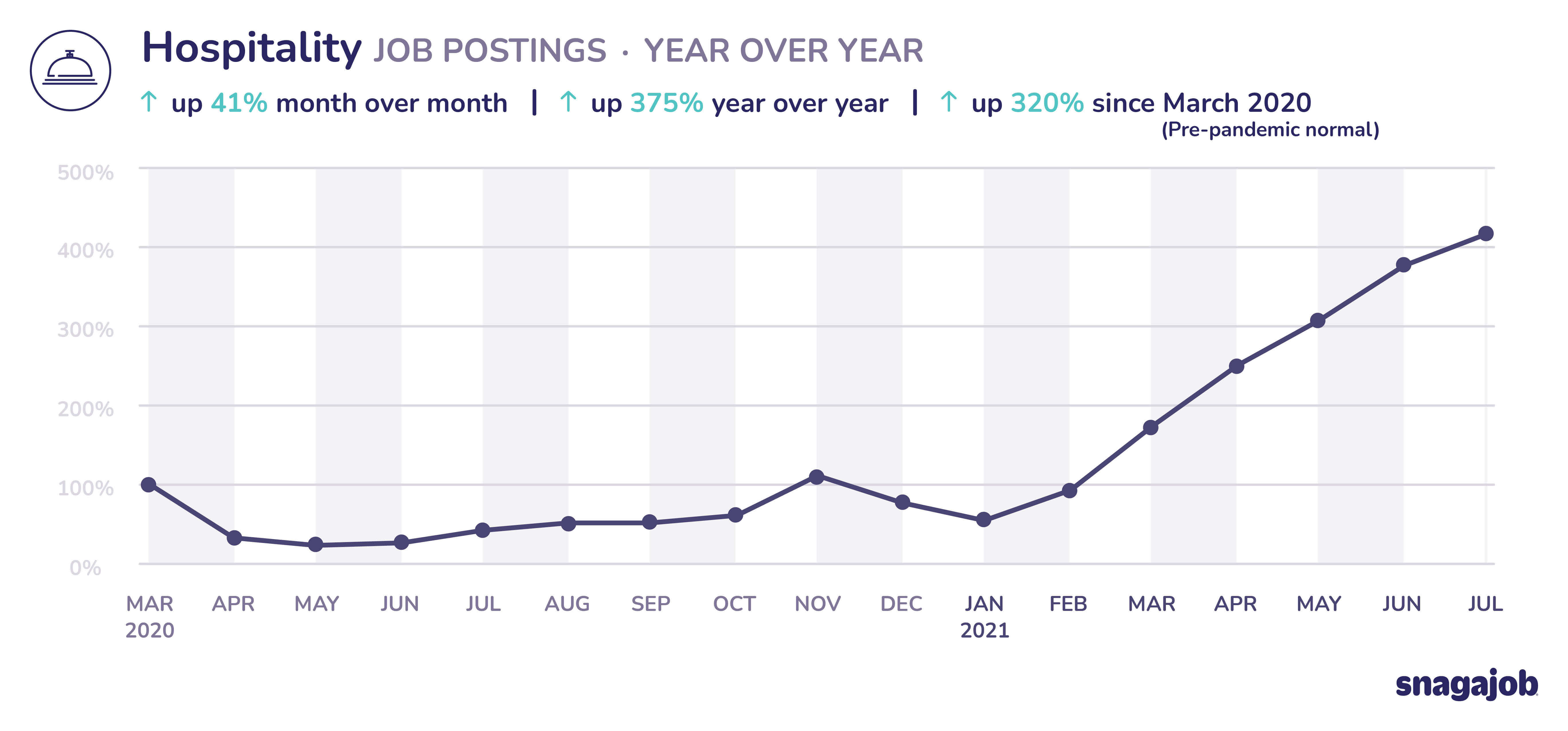 Hospitality jobs are up 320% compared to pre-pandemic norms, seeing 41% month over month growth and 375% year over year growth.