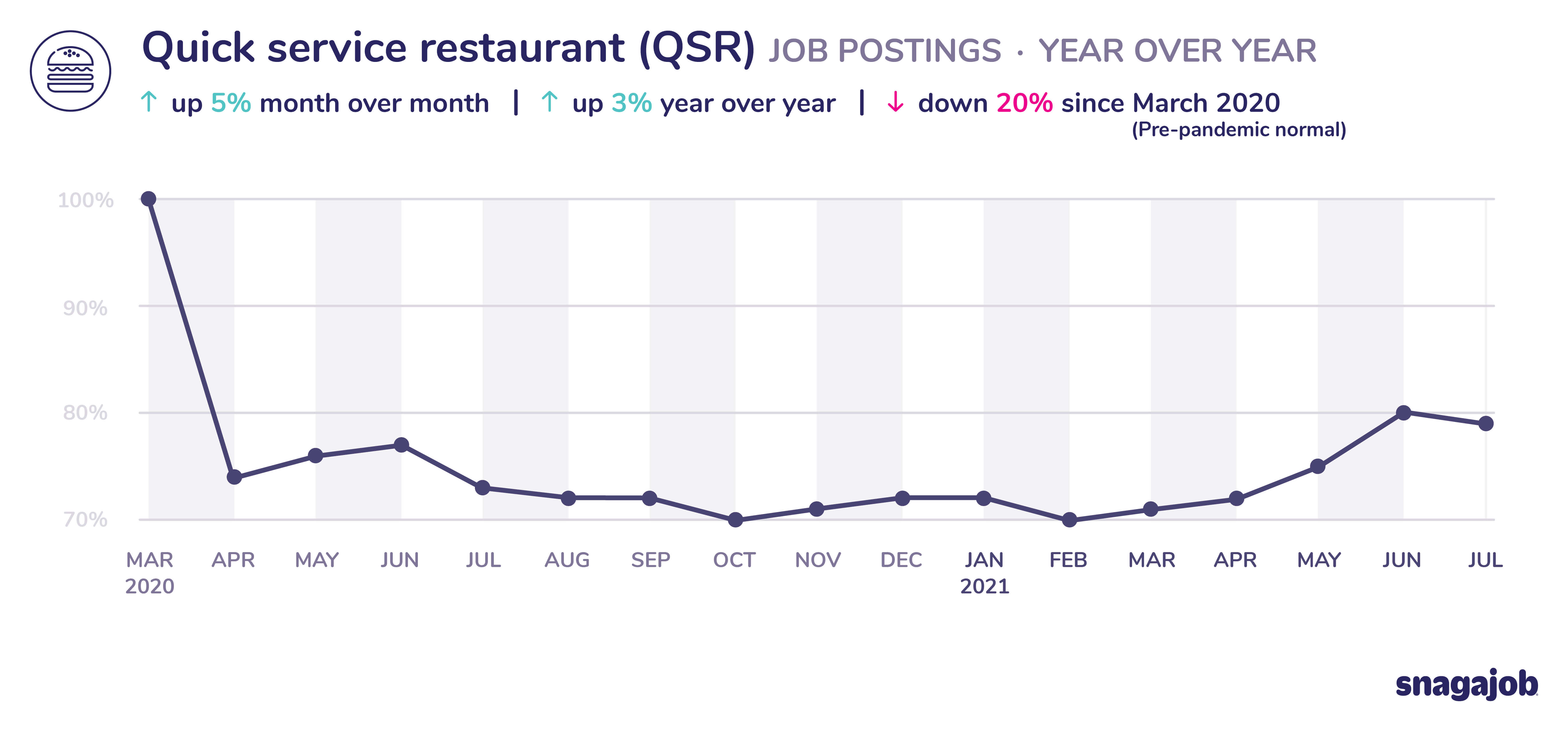 Quick service restaurant (QSR) jobs are down 20% compared to pre-pandemic norms, seeing 5% month over month growth and 3% year over year growth.
