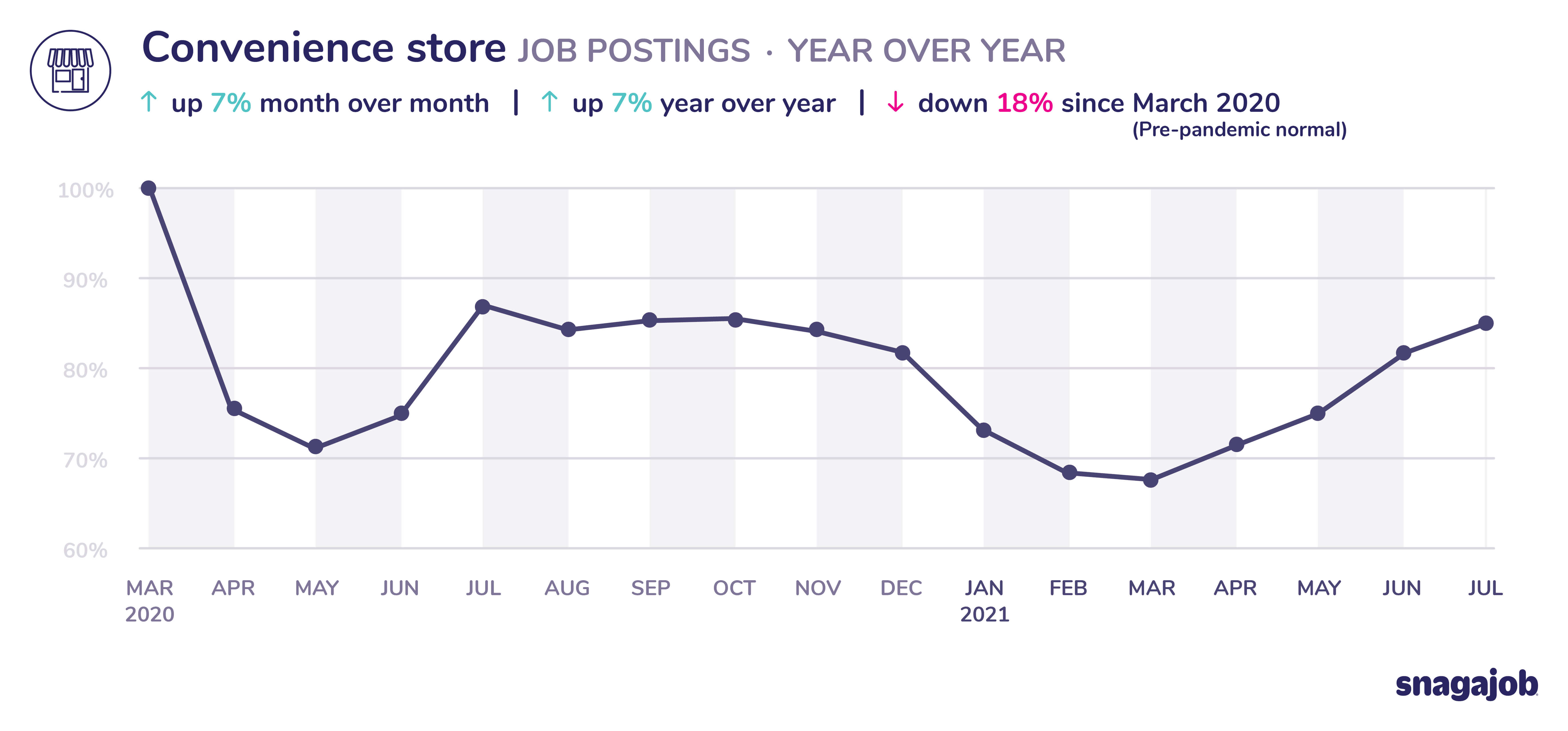 Convenience store jobs are down 18% compared to pre-pandemic norms, seeing 7% month over month growth and 7% year over year growth.