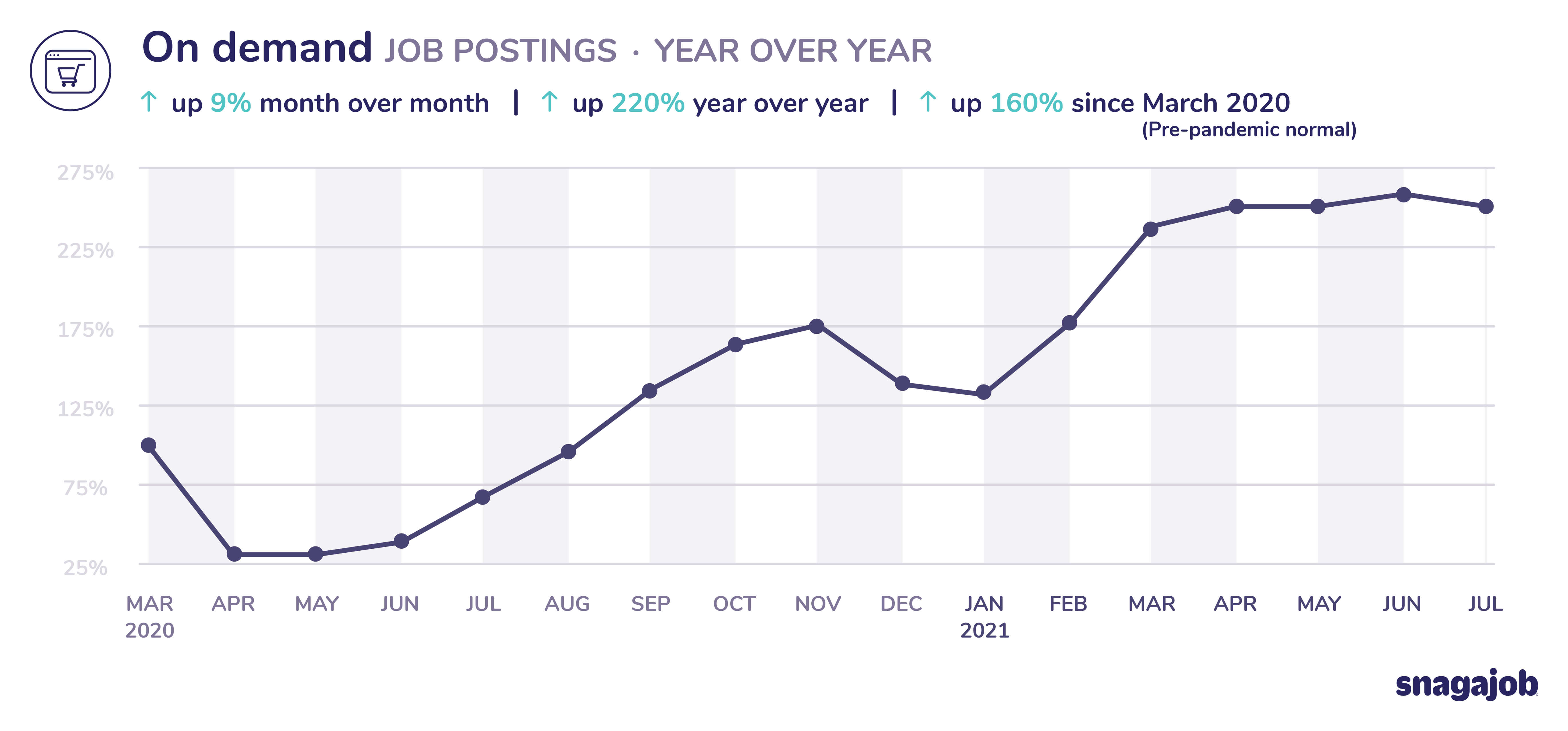 On demand jobs are up 160% compared to pre-pandemic norms, seeing 9% month over month growth and 220% year over year growth.