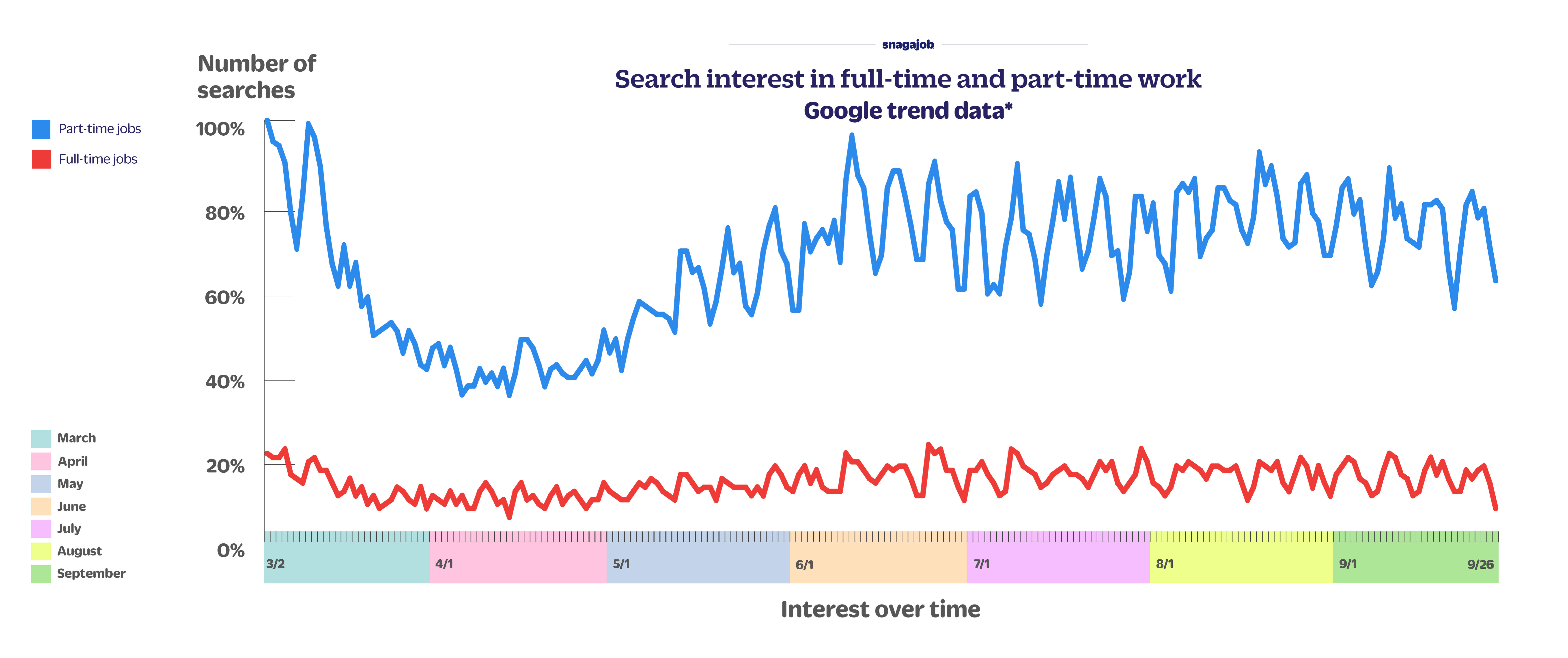 Google searches for part-time jobs are up 6% week over week, down 16% month over month and down 38% since early March.