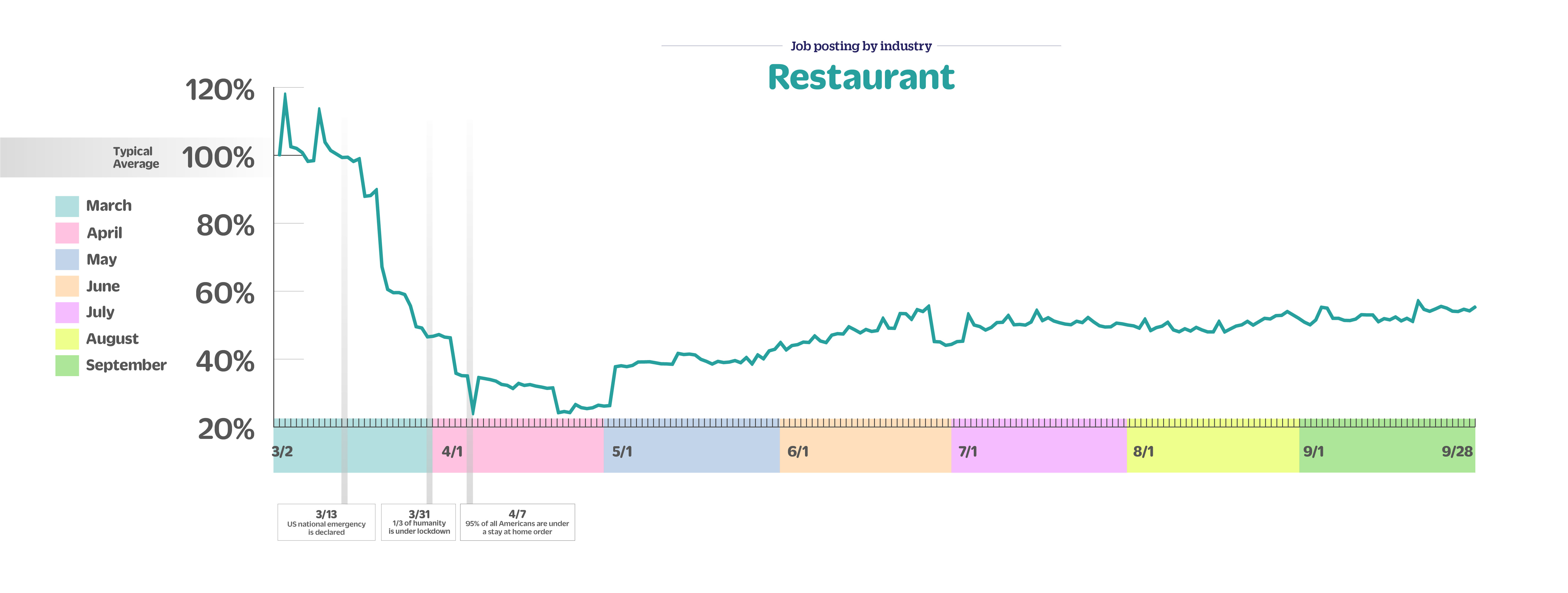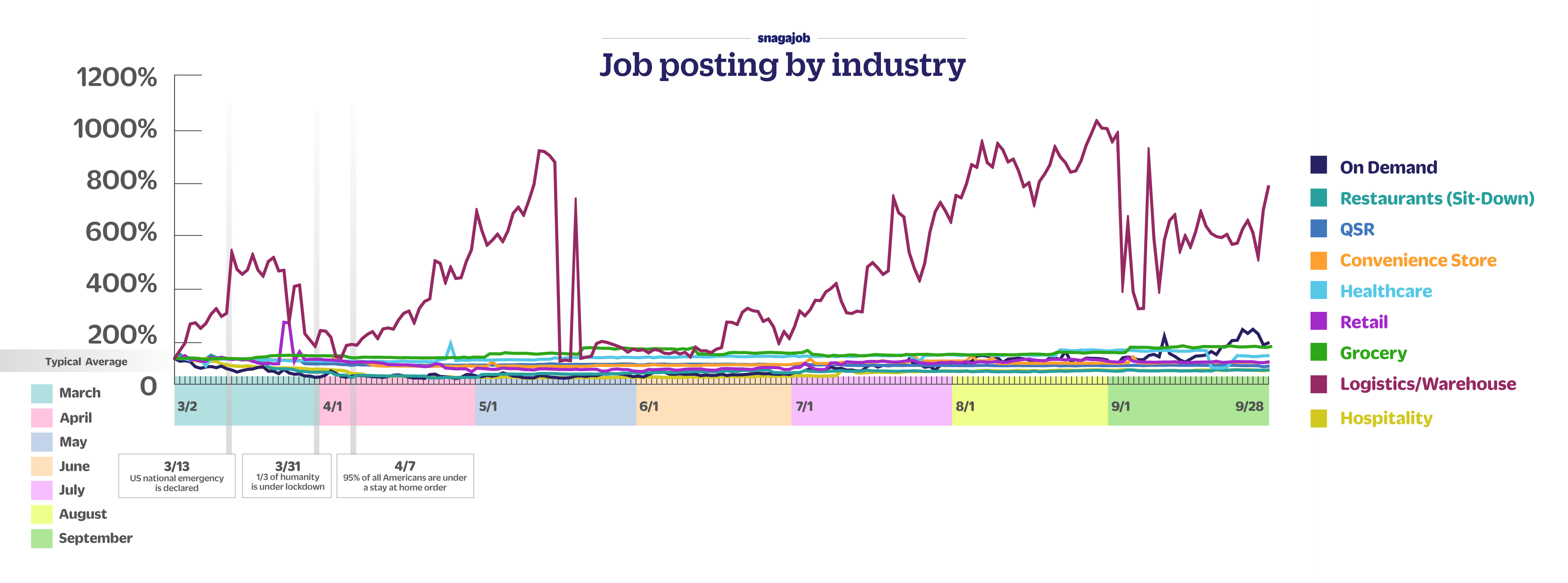 Snagajob is here to help you navigate the hourly hiring landscape during this pandemic. Our proprietary data gives us a unique perspective on hourly job trends and we can see how both workers and employers are responding in real-time. One of the most valuable things we can offer you is a view into these insights and hiring trends. We’re here to give you helpful context as you make business decisions.