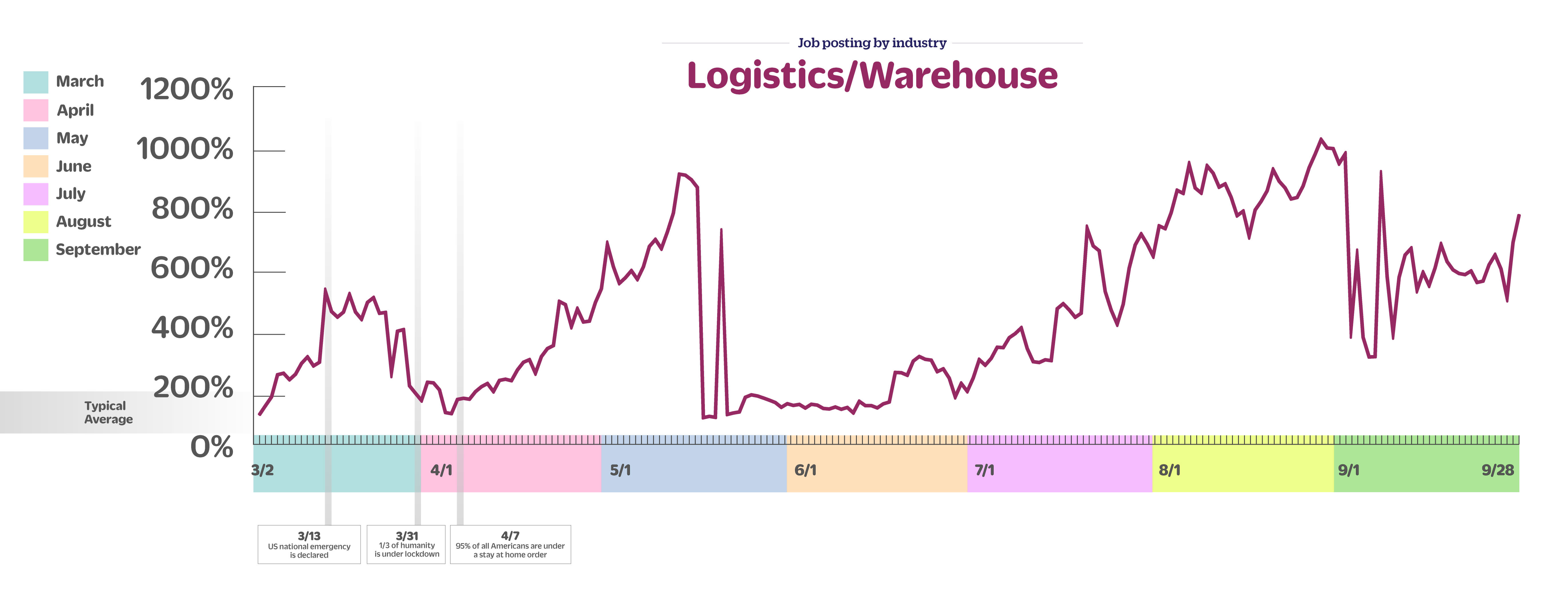 Warehouse and logistics jobs are up 226% week over week, down 224% month over month and up 669% since early March.