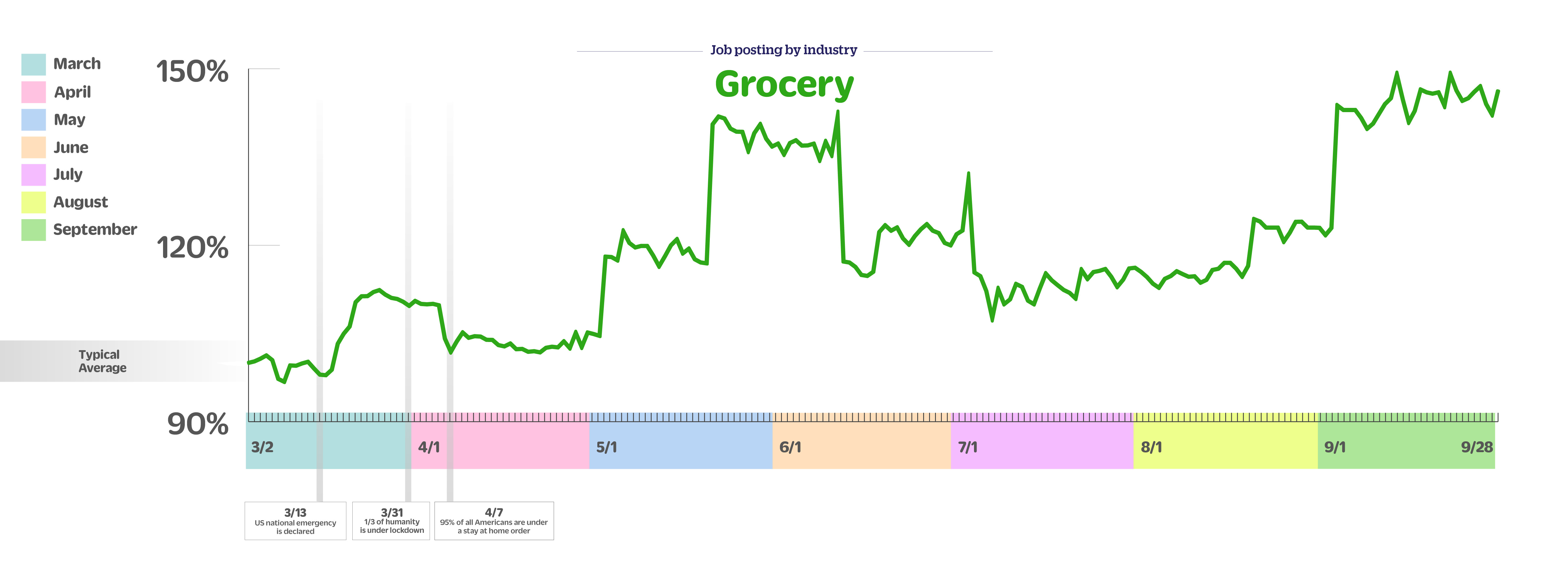 Grocery jobs are flat week over week, up 23% month over month and up 46% since early March.