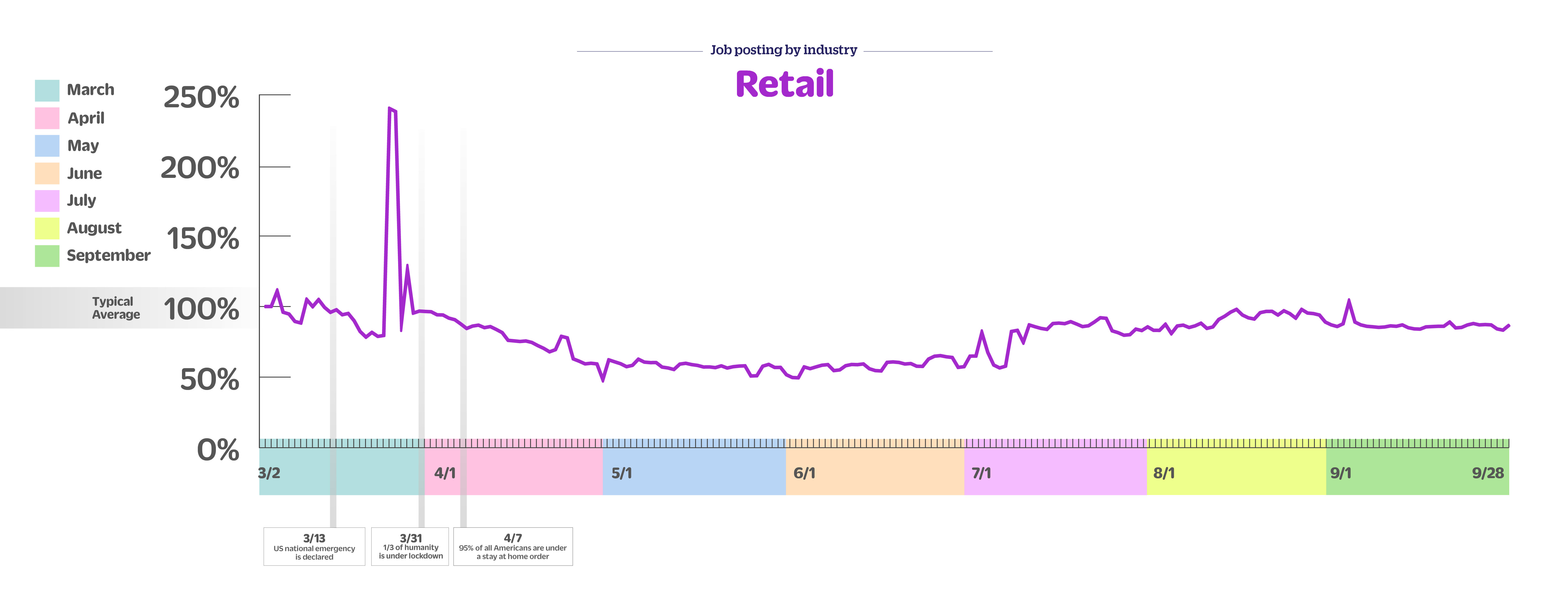 Retail jobs are flat week over week, down 3% month over month and down 13% since early March.