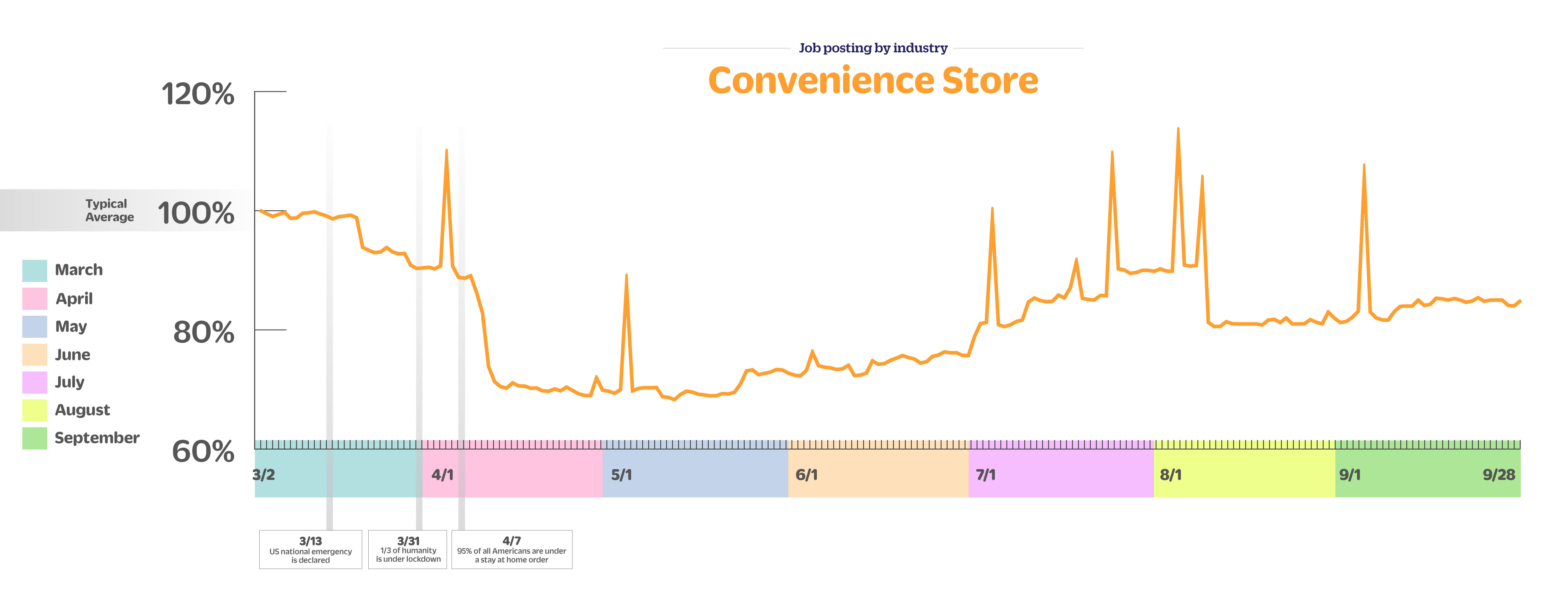 Convenience store jobs are down 1% week over week, up 3% month over month and down 15% since early March.
