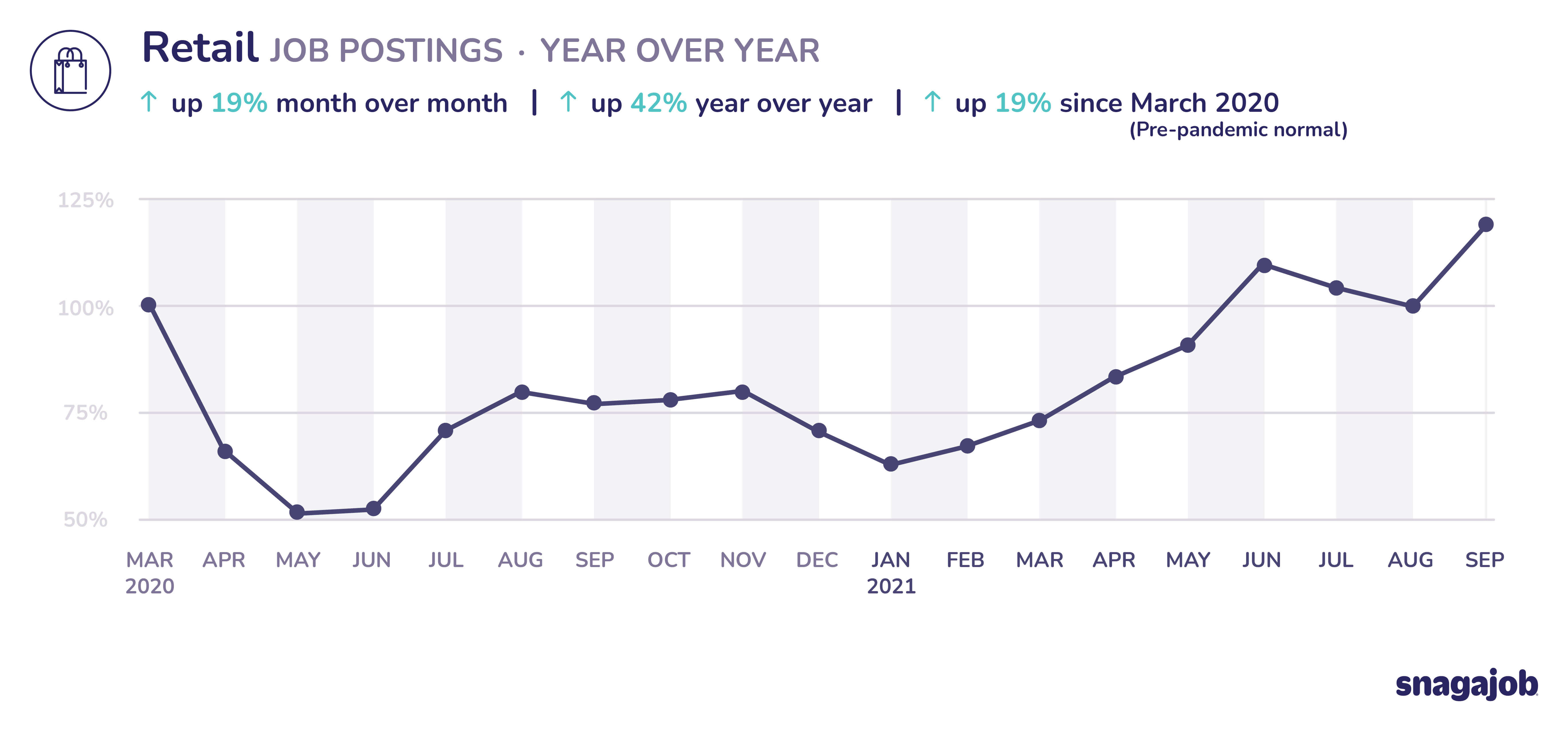 Retail jobs are up 19% compared to pre-pandemic norms, seeing 19% month over month growth and 42% year over year growth.